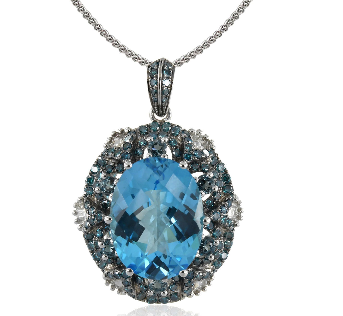 14K WHITE GOLD DIAMOND, TREATED BLUE DIAMOND AND LONDON BLUE TOPAZ PENDANT WITH CHAIN