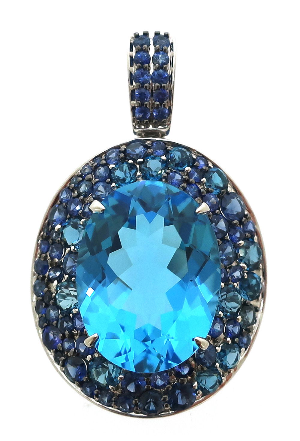 14K WHITE GOLD SAPPHIRE, LONDON BLUE TOPAZ AND SWISS BLUE TOPAZ PENDANT WITH CHAIN