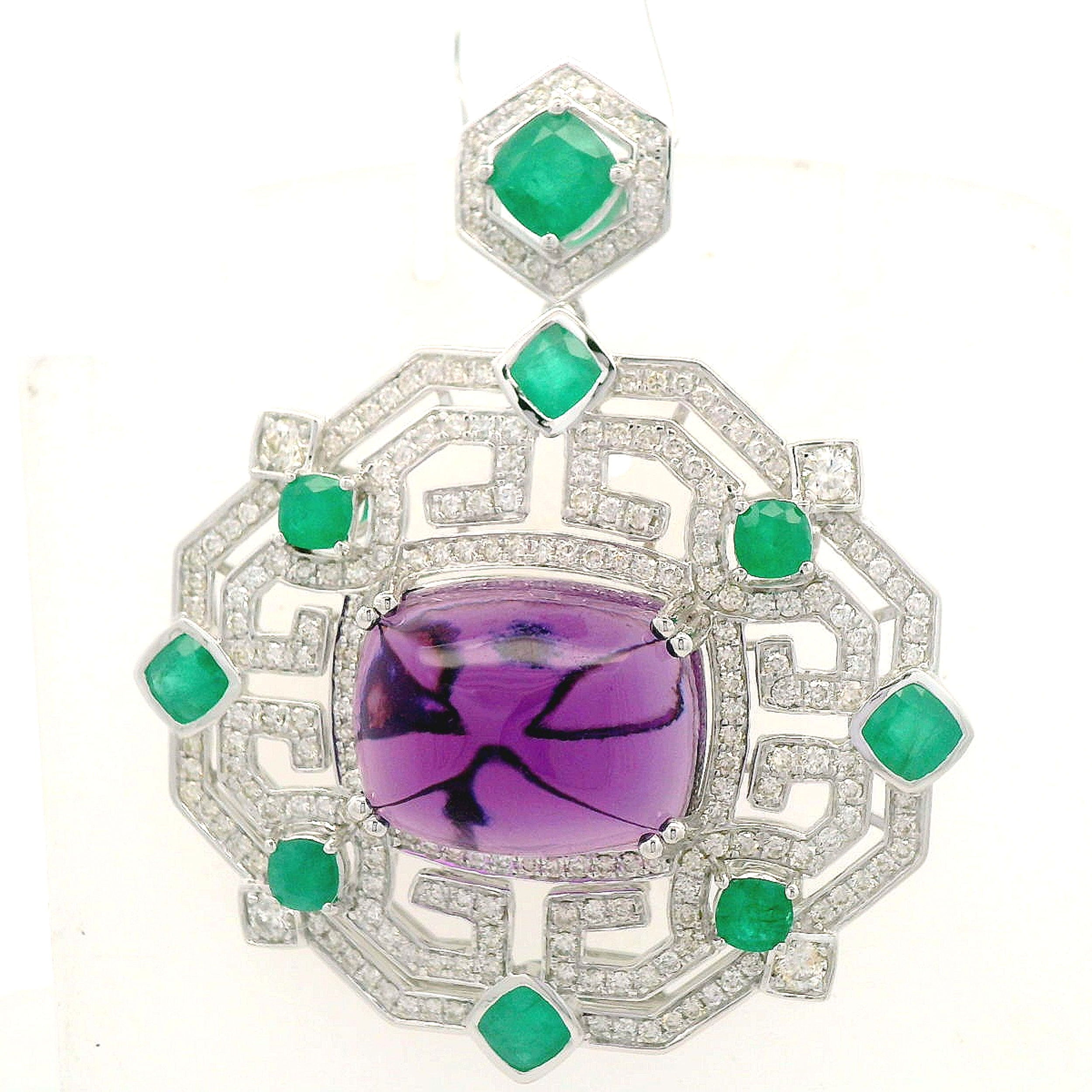 14K WHITE GOLD DIAMOND, EMERALD AND AMETHYST PENDANT WITH CHAIN