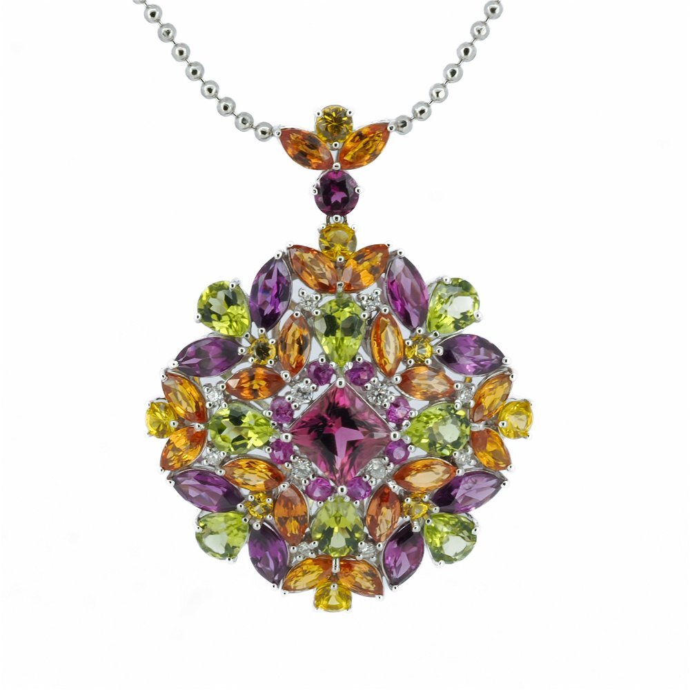 14K WHITE GOLD DIAMON, MULTICOLOR GEM STONE, MULTICOLOR SAPPHIRE AND PINK TOURMALINE PENDANT WITH CHAIN