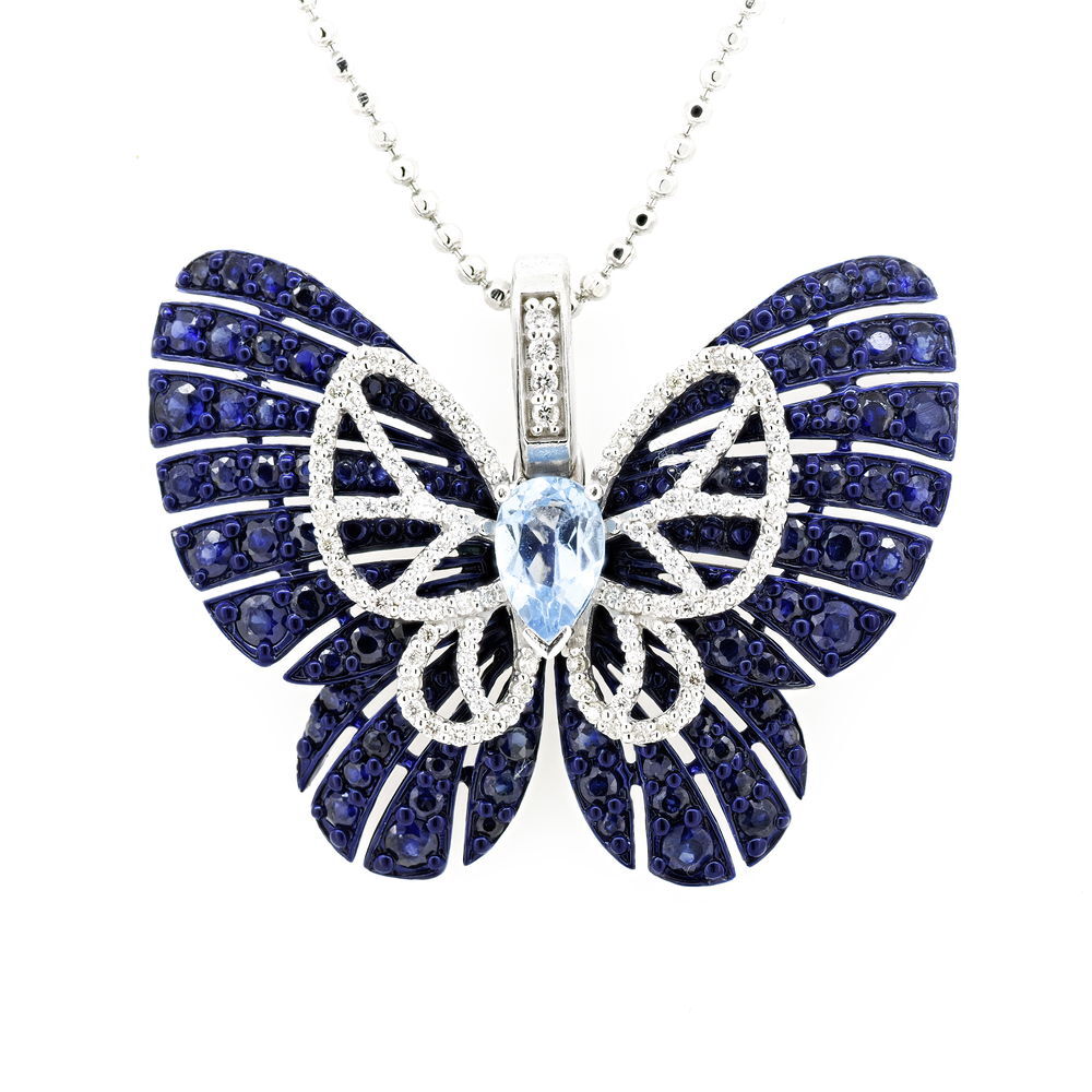 - 14K WHITE GOLD DIAMOND, SAPPHIRE AND SWISS BLUE TOPAZ BUTTERFLY PENDANT WITH CHAIN