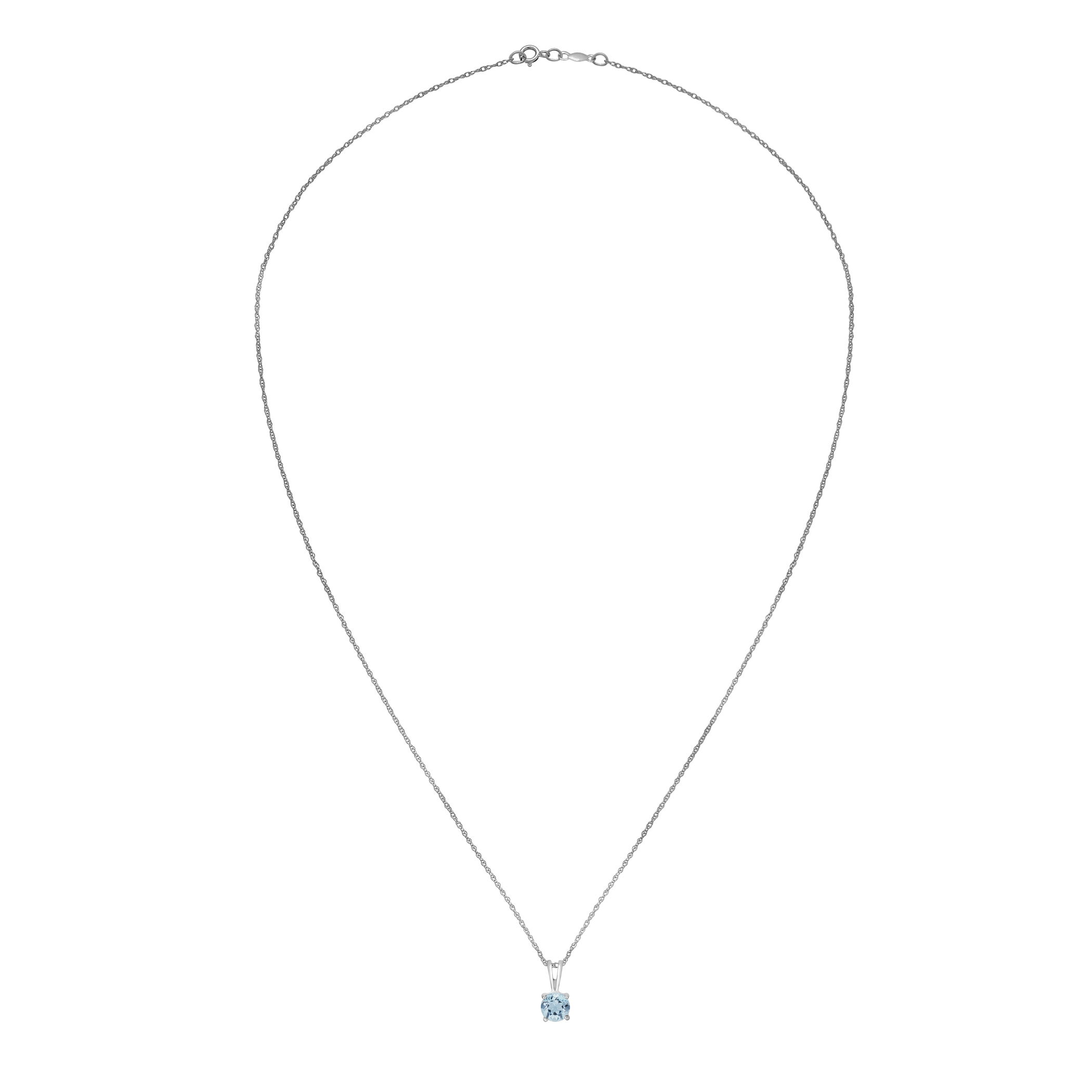 This dazzling white gold necklace features a luminous aquamarine gemstone.• 5mm Round Aquamarine Gemstone• 14K White Gold Setting• 18" Rope Chain With Spring Lock• Semi Precious Birthstone Collection
