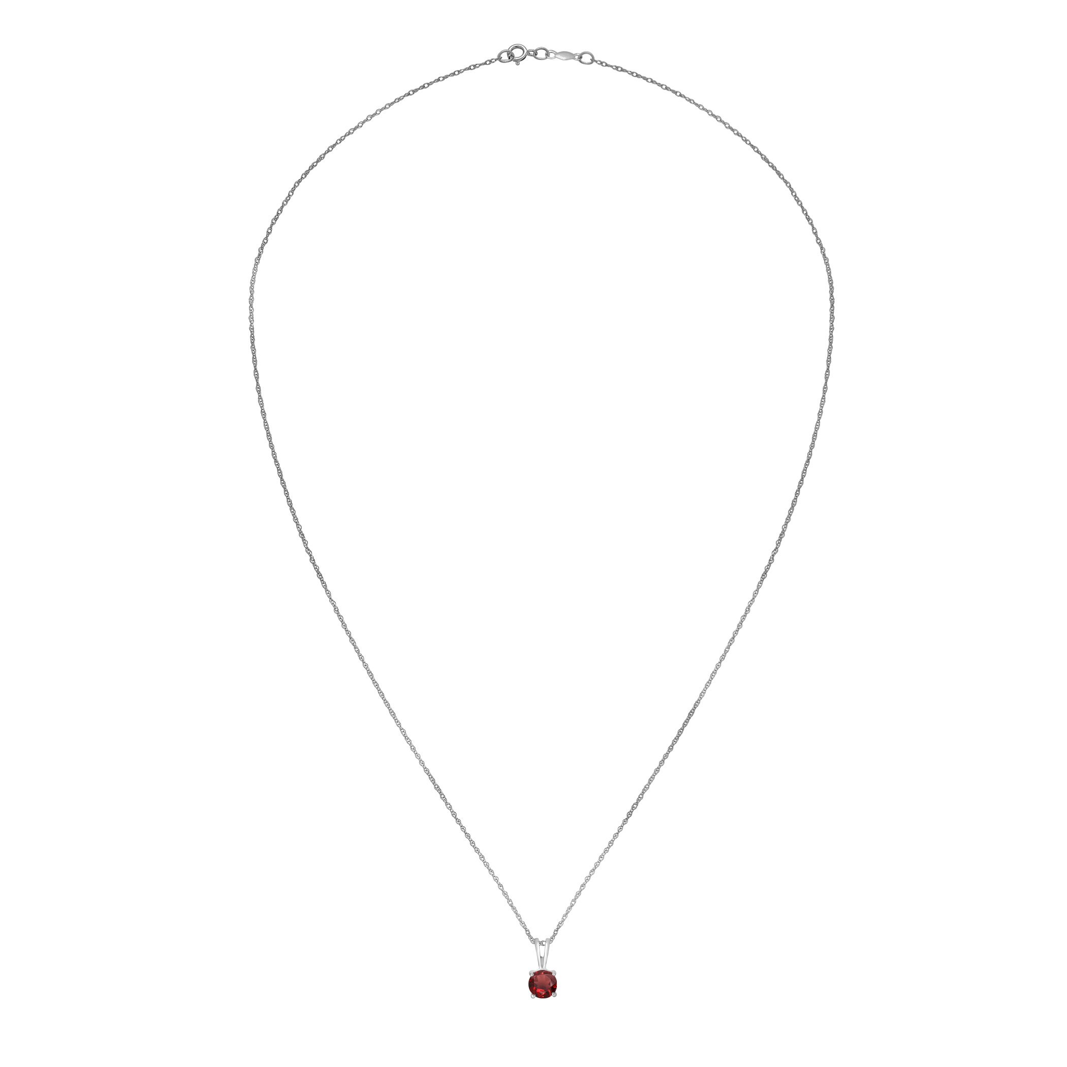 This dazzling white gold necklace features a fiery garnet gemstone.• 5mm Round Garnet Gemstone• 14K White Gold Setting• 18" Rope Chain With Spring Lock• Semi Precious Birthstone Collection