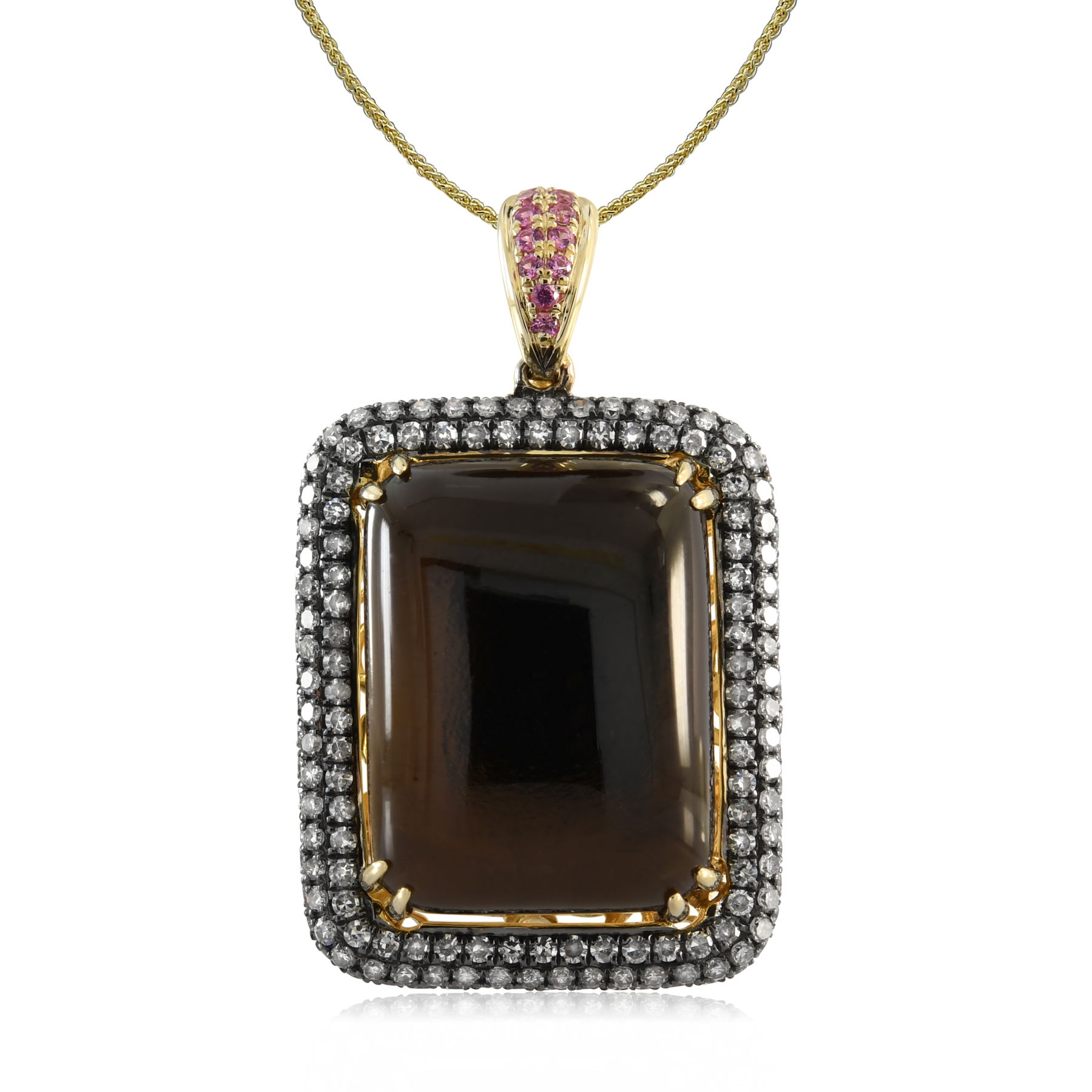 14K YELLOW GOLD DIAMOND, PINK SAPPHIRE AND SMOKY QUARTZ PENDANT WITH CHAIN