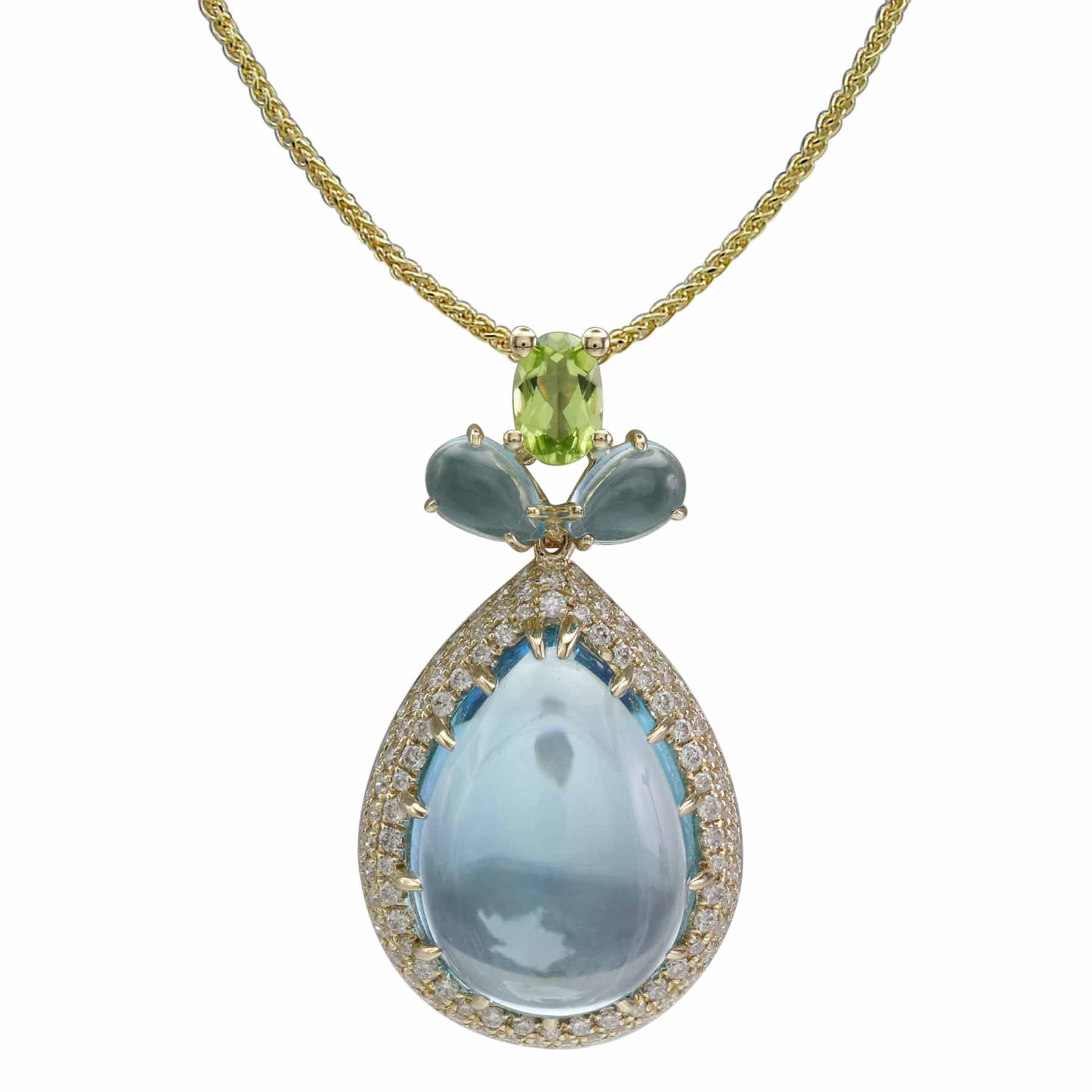 14K YELLOW GOLD DIAMOND, PERIDOT AND SWISS BLUE TOPAZ PENDANT WITH CHAIN
