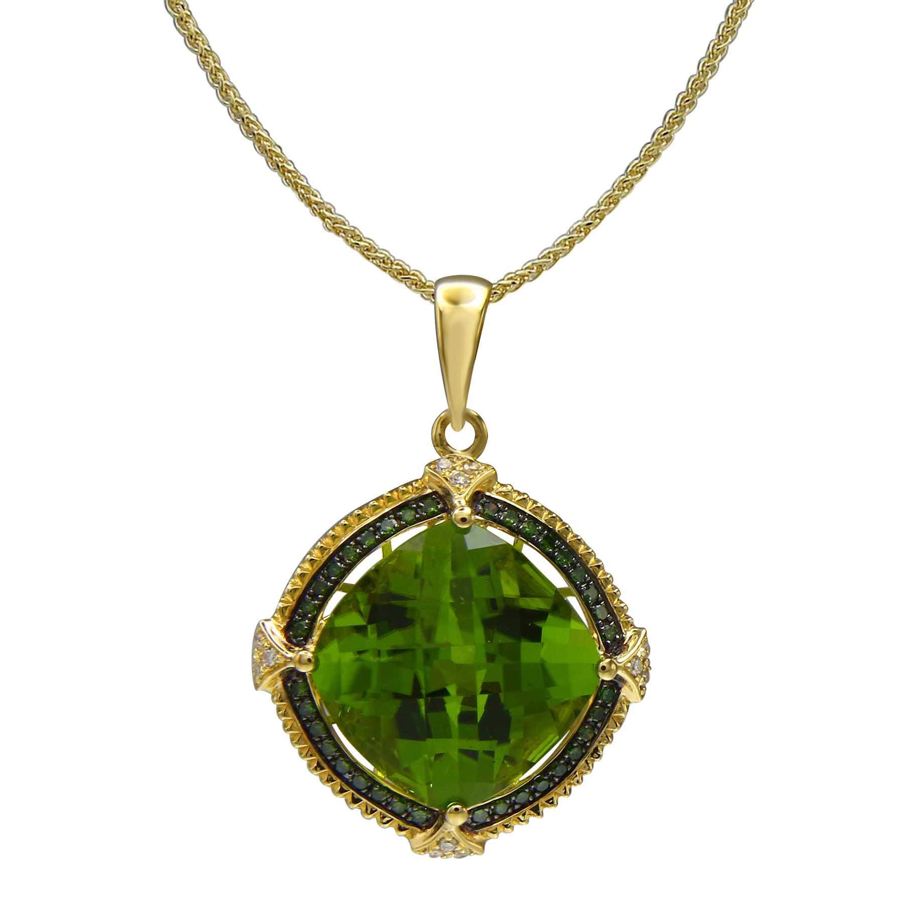 14K YELLOW GOLD DIAMOND, TREATED GREEN DIAMOND AND PERIDOT PENDANT WITH CHAIN