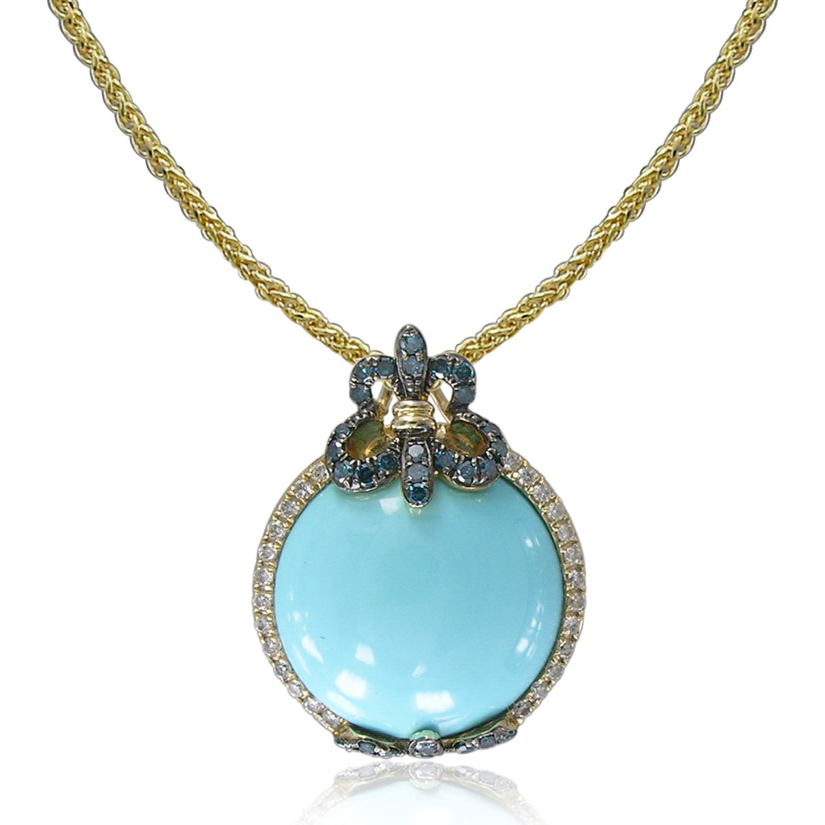 14K YELLOW GOLD DIAMOND, TREATED BLUE DIAMOND AND TURQUOISE PENDANT WITH CHAIN