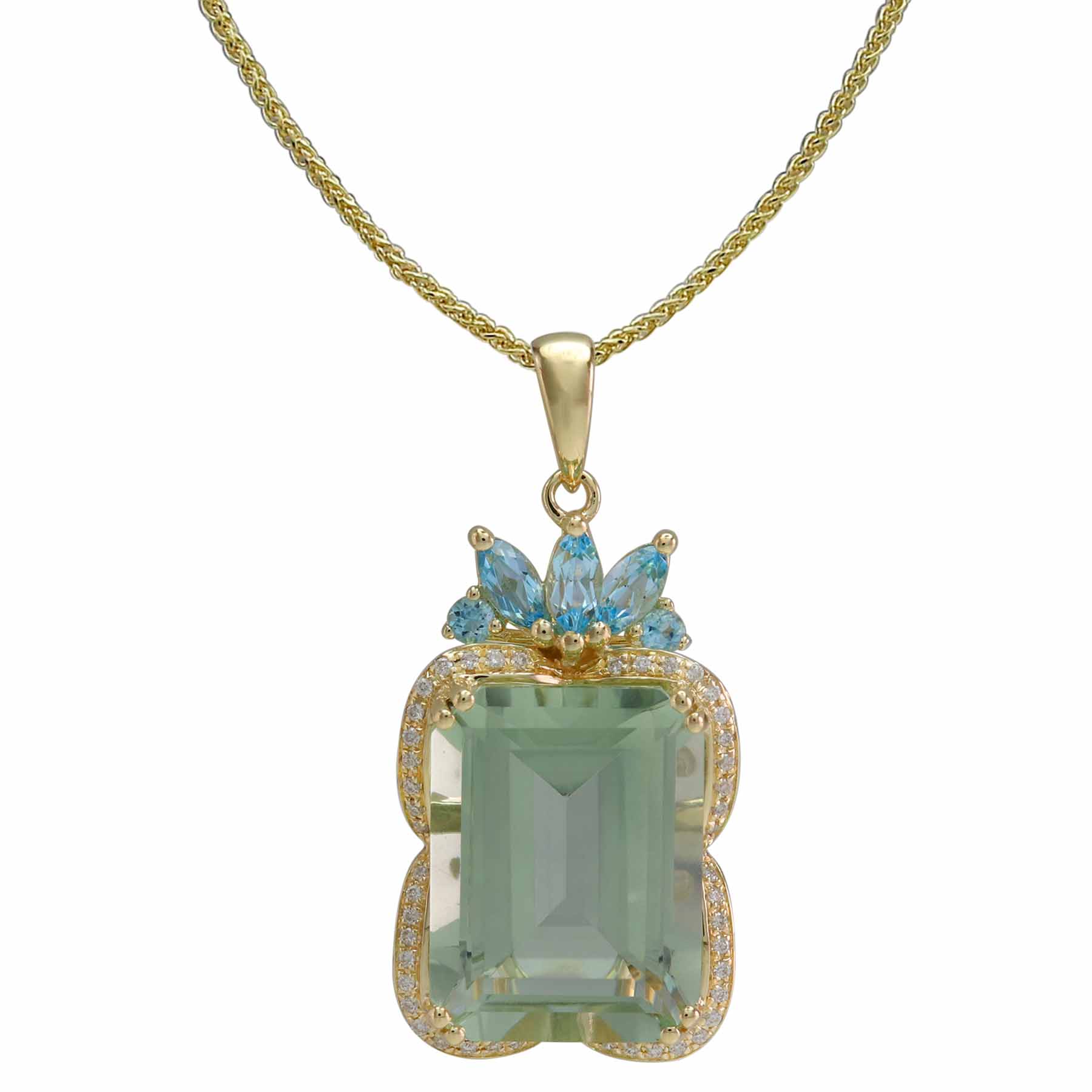 14K YELLOW GOLD DIAMOND, SWISS BLUE TOPAZ AND GREEN AMETHYST PENDANT WITH CHAIN