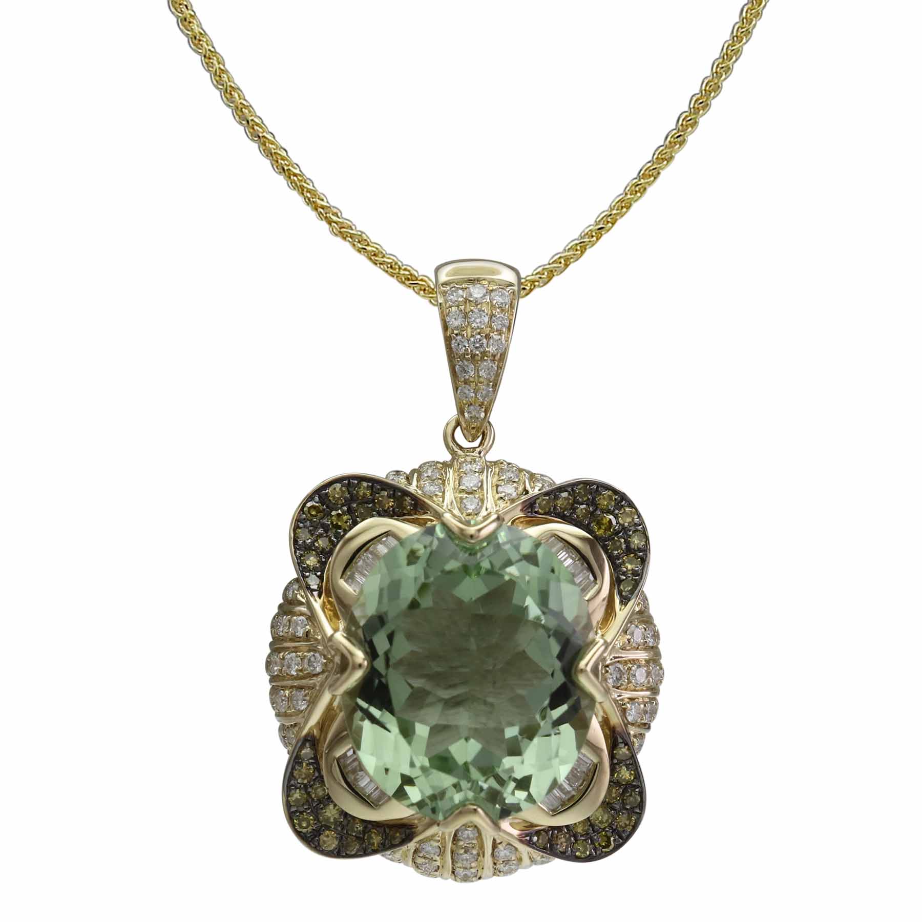 14K YELLOW GOLD DIAMOND, TREATED YELLOW DIAMOND AND GREEN AMETHYST PENDANT WITH CHAIN