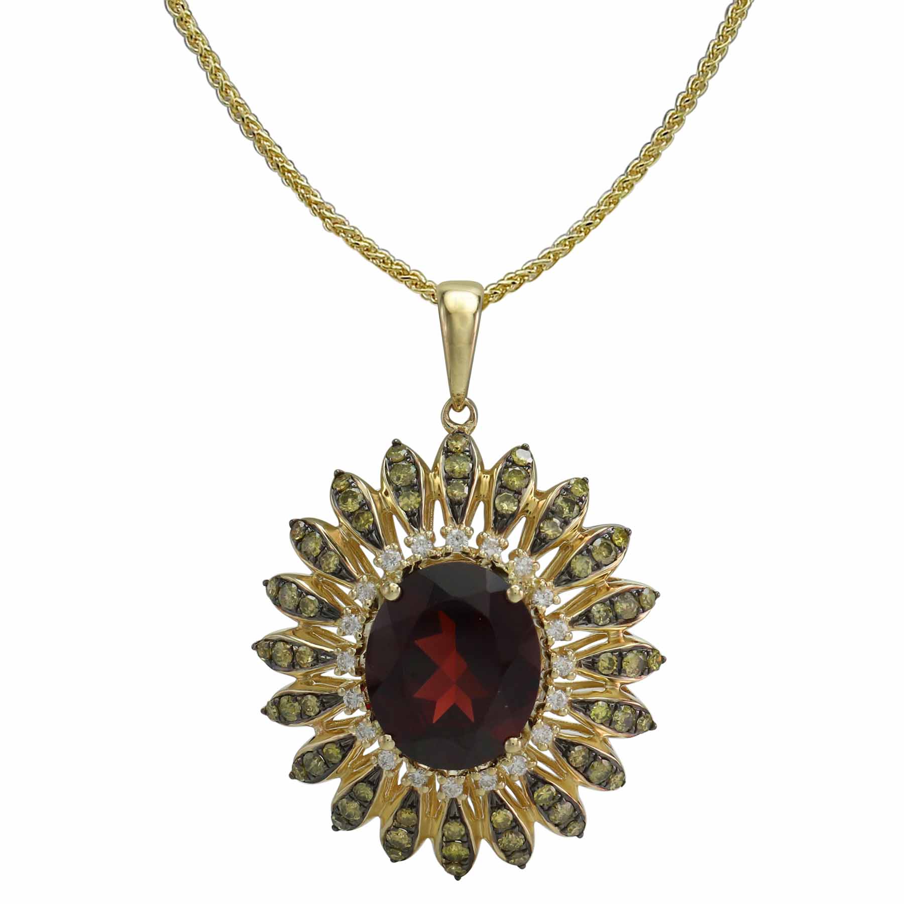 14K YELLOW GOLD DIAMOND, TREATED YELLOW DIAMOND AND GARNET PENDANT WITH CHAIN