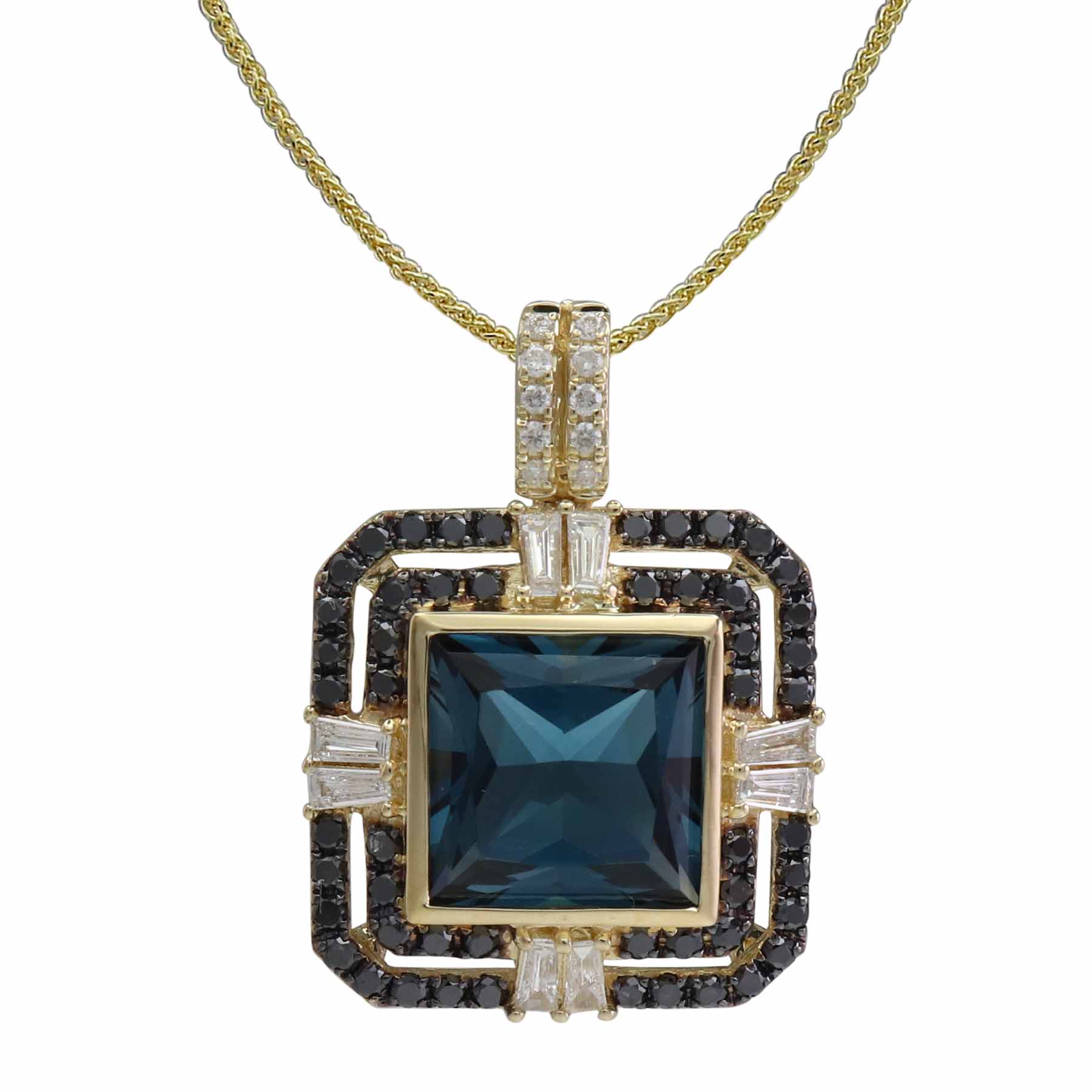 14K YELLOW GOLD DIAMOND, TREATED BLACK DIAMOND AND LONDON BLUE TOPAZ PENDANT WITH CHAIN