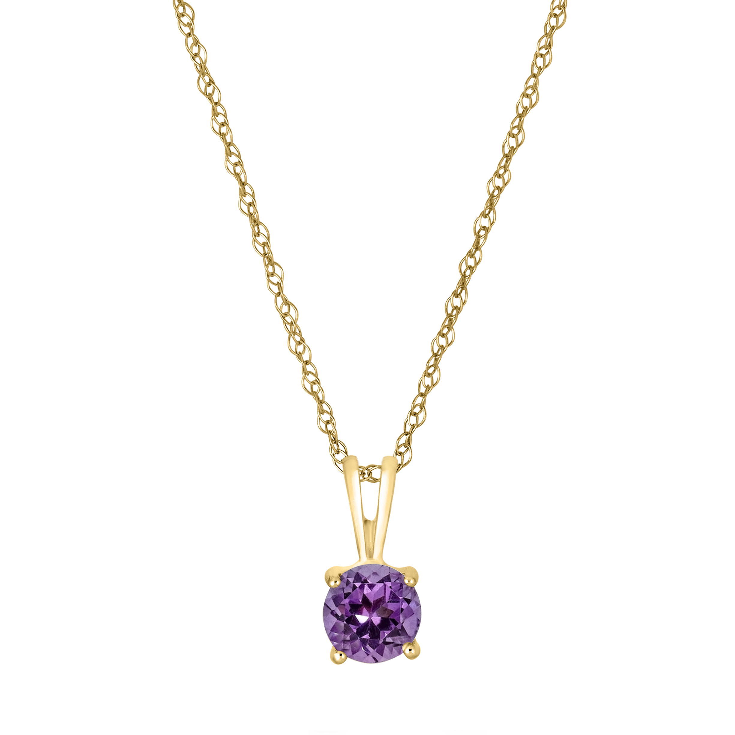 This dazzling yellow gold necklace features a vibrant amethyst gemstone.• 5mm Round Amethyst Gemstone• 14K Yellow Gold Setting• 18" Rope Chain With Spring Lock• Semi Precious Birthstone Collection