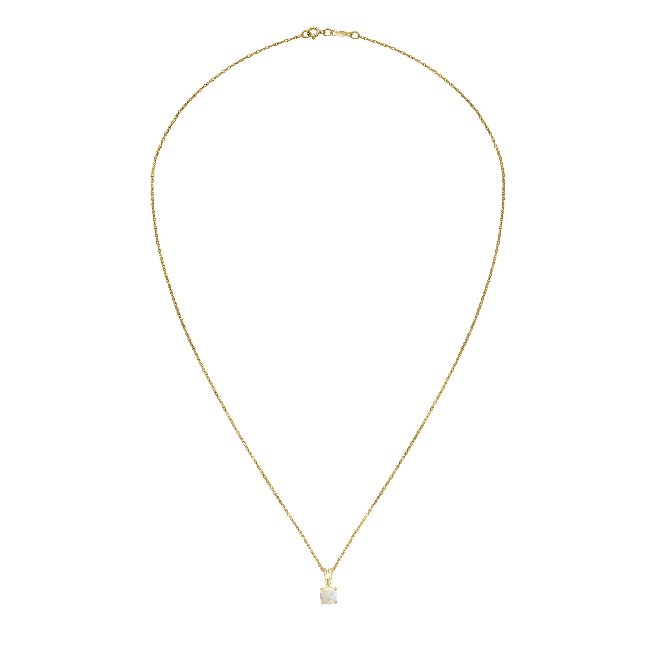 This dazzling yellow gold necklace features an iridescent Australian opal gemstone.• 5mm Round Australian Opal Gemstone• 14K Yellow Gold Setting• 18" Rope Chain With Spring Lock• Semi Precious Birthstone Collection