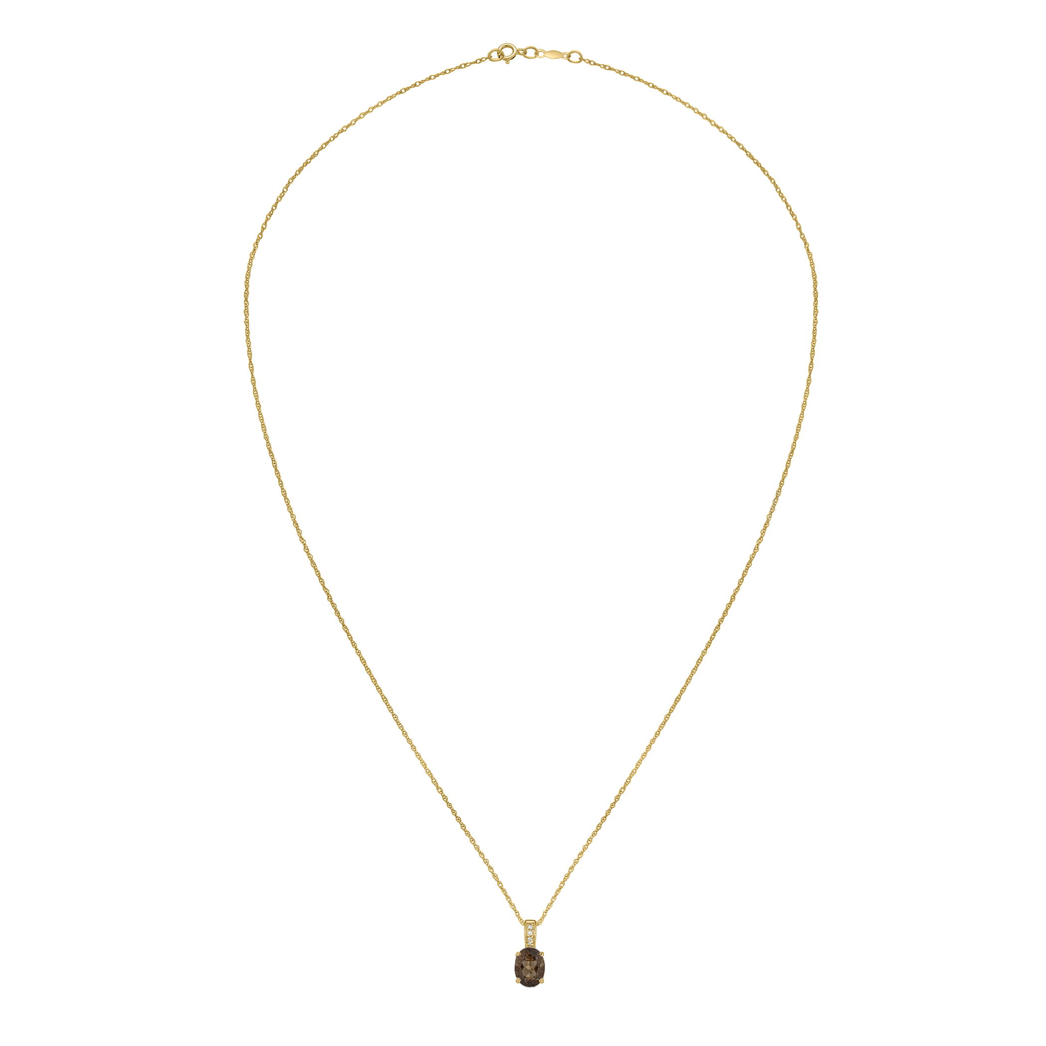 Rich smoky quartz is set alongside glittering diamonds in this refined yellow gold necklace.• 8x6mm Oval Smoky Quartz Gemstone• 14K Yellow Gold Setting• Diamond Accents• 18" Rope Chain With Spring Lock• Semi Precious Birthstone Collection