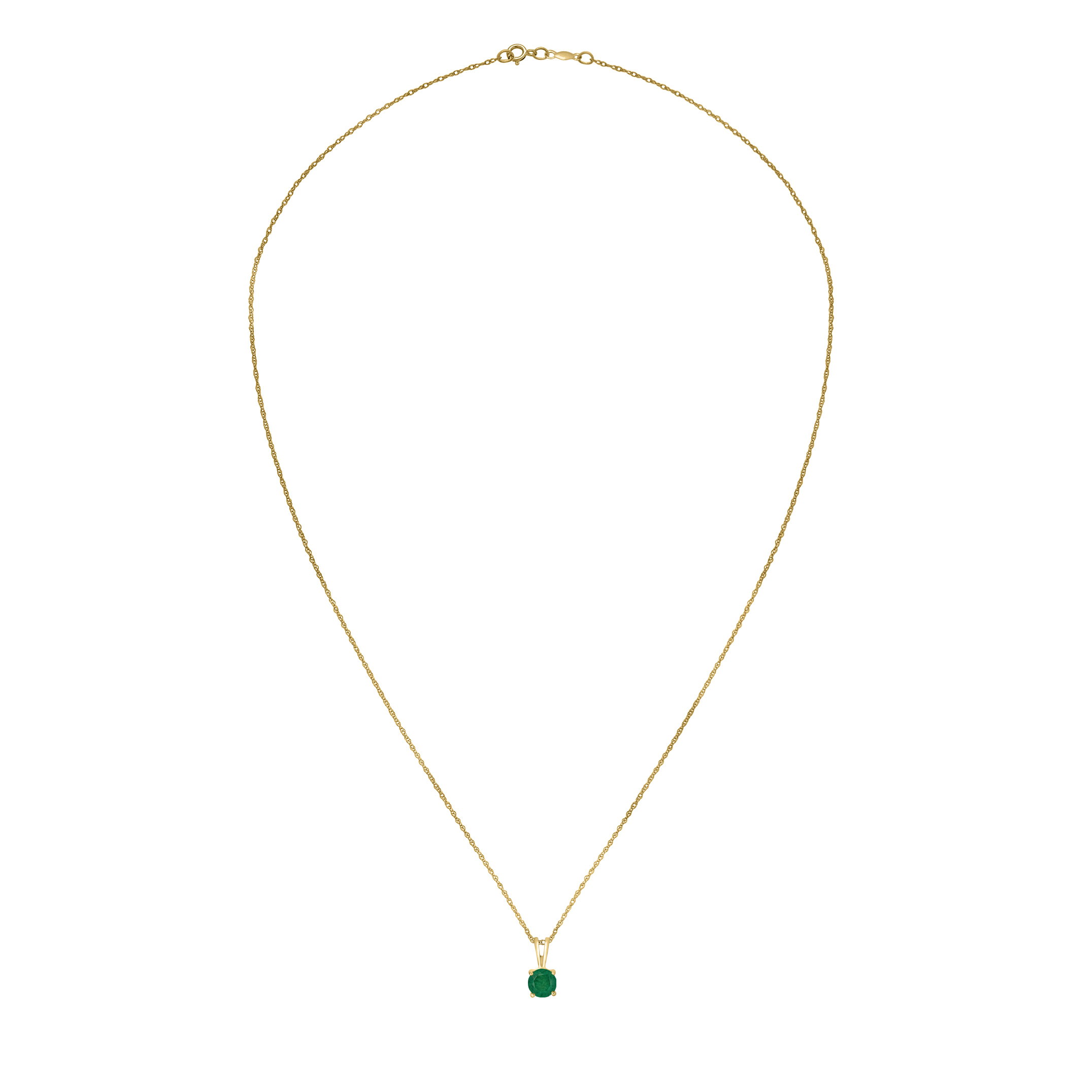This stunning yellow gold necklace features a brilliant emerald gemstone.• 5mm Round Emerald Gemstone• 14K Yellow Gold Setting• 18" Rope Chain With Spring Lock• Precious Birthstone Collection