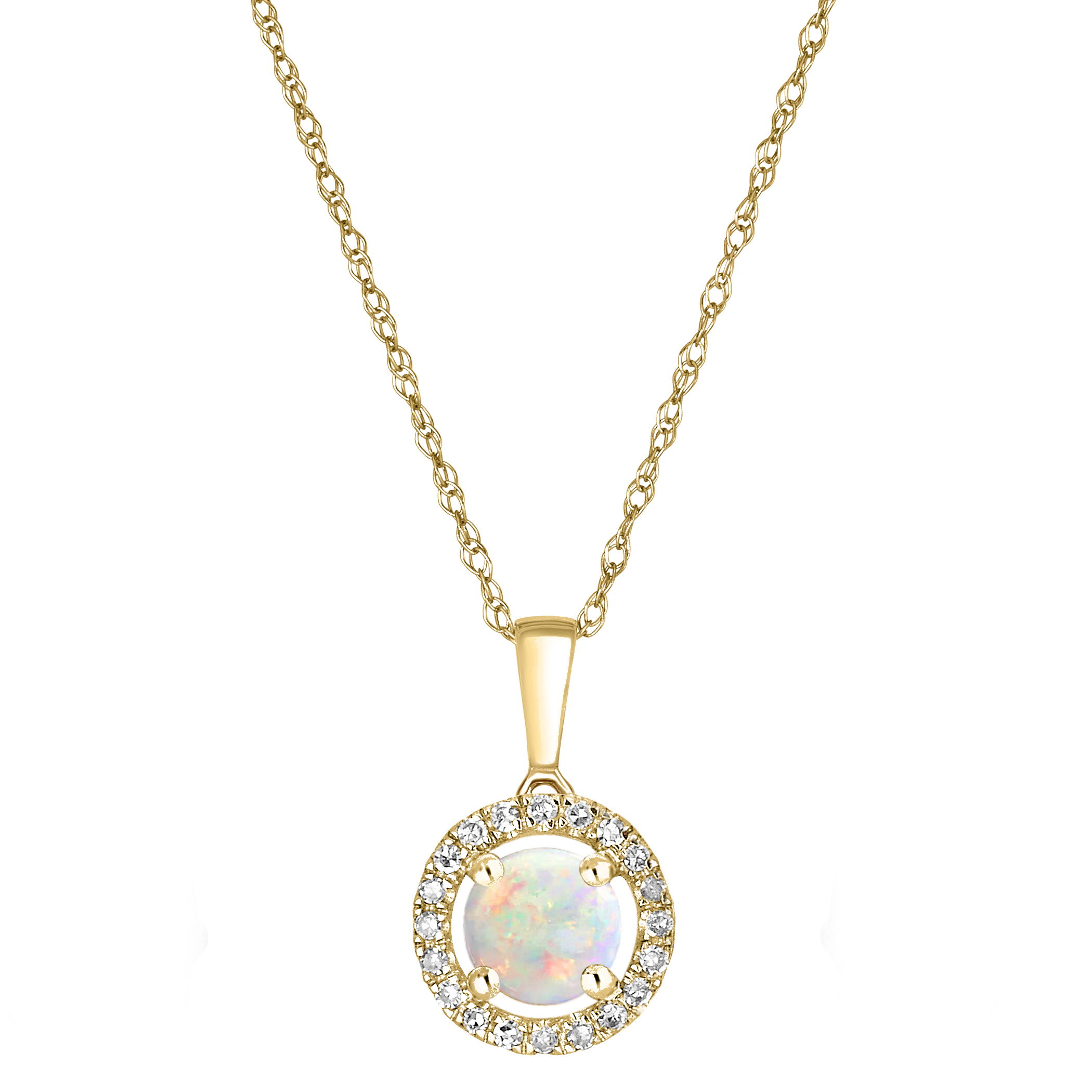 Iridescent opal is surrounded by sparkling diamonds in this stunning yellow gold necklace.• 5mm Round Australian Opal Gemstone• 14K Yellow Gold Setting• Diamond Accents• 18" Rope Chain With Spring Lock• Semi Precious Birthstone Collection