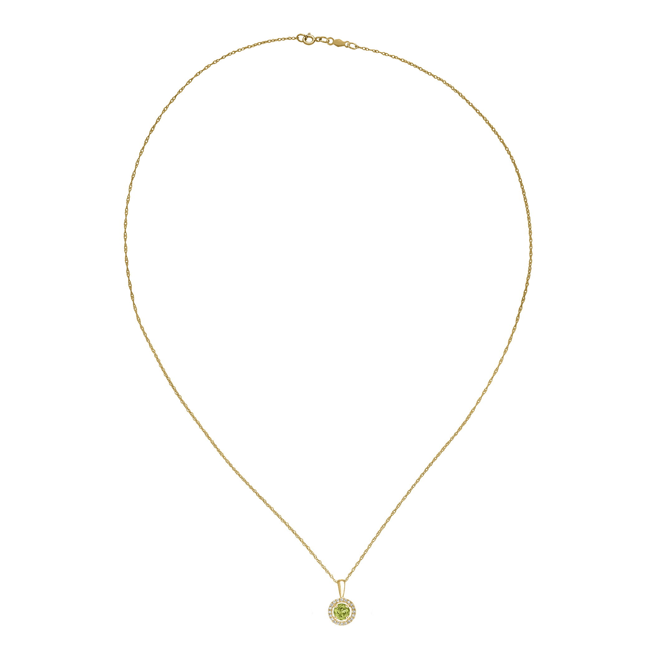 Luminous peridot is surrounded by sparkling diamonds in this stunning yellow gold necklace.• 5mm Round Peridot Gemstone• 14K Yellow Gold Setting• Diamond Accents• 18" Rope Chain With Spring Lock• Semi Precious Birthstone Collection
