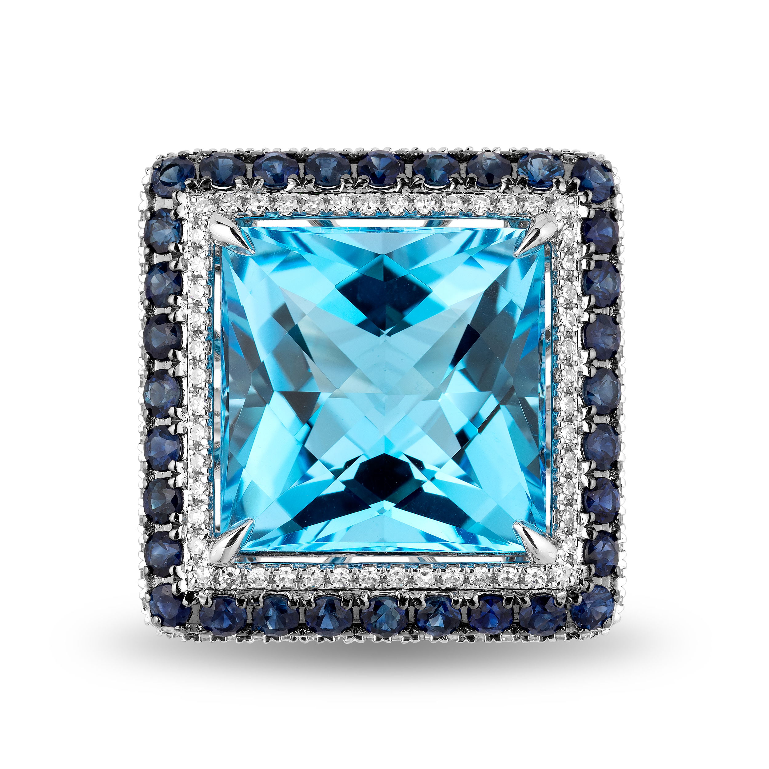 18K WHITE GOLD DIAMOND, SAPPHIRE AND SWISS BLUE TOPAZ RING