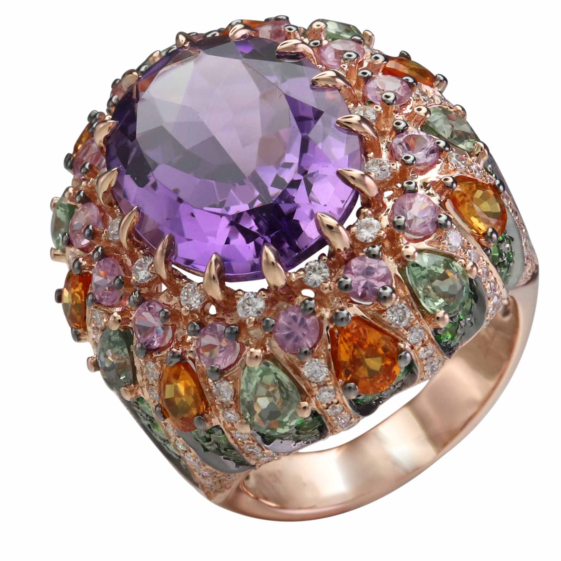 14K ROSE GOLD DIAMOND, MULTICOLOR SAPPHIRE AND PINK AMETHYST RING