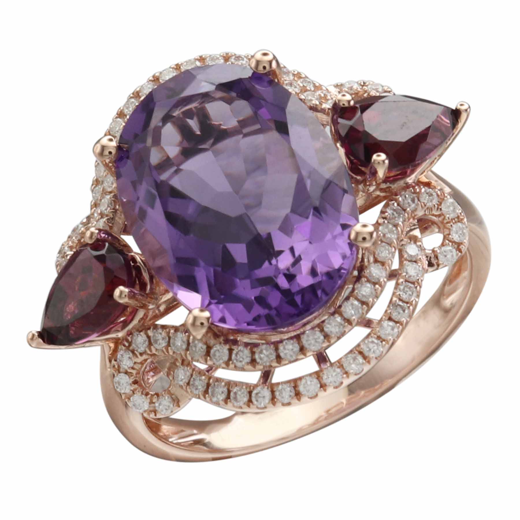 14K ROSE GOLD DIAMOND, RHODOLITE AND AMETHYST RING