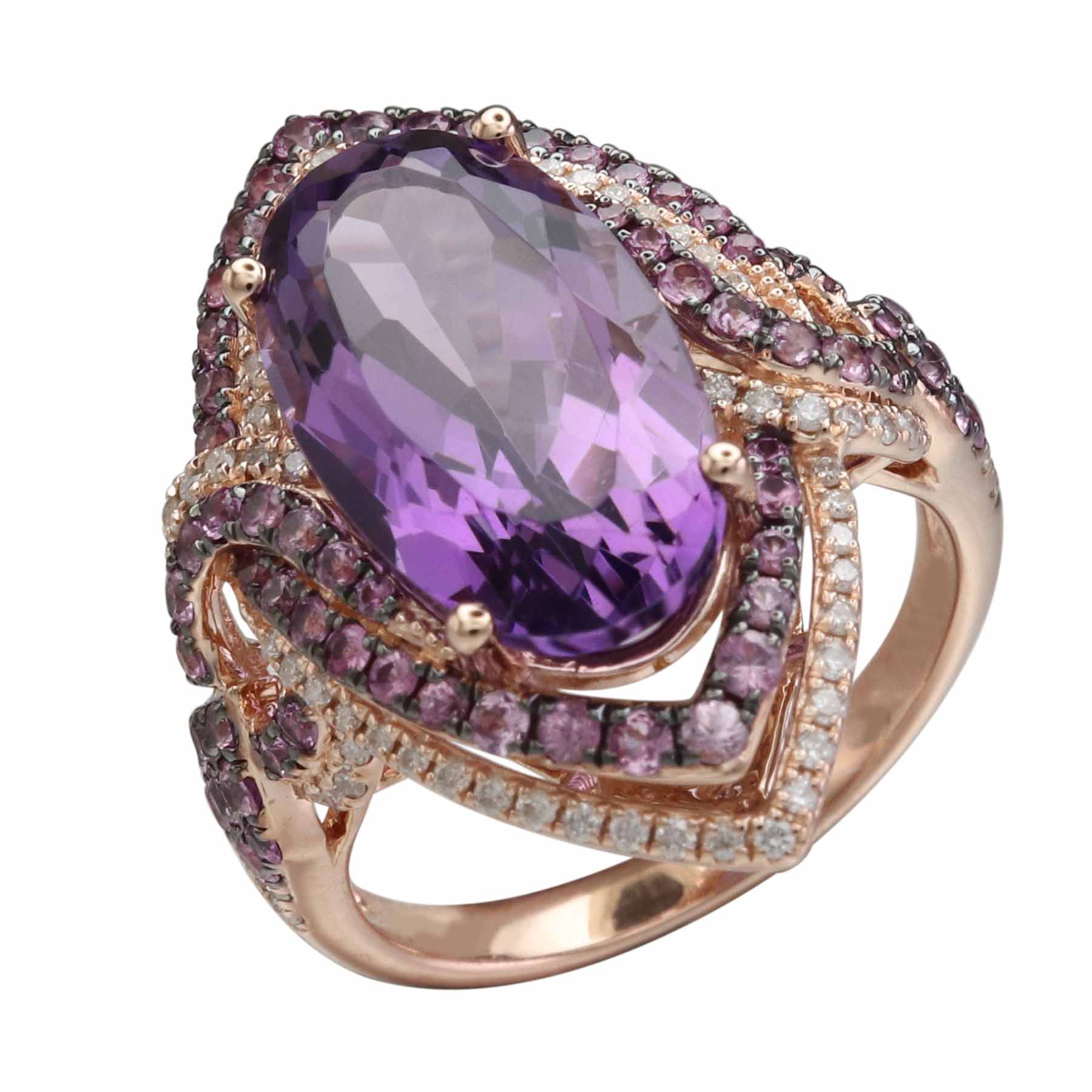 14K ROSE GOLD DIAMOND, PINK SAPPHIRE AND AMETHYST RING