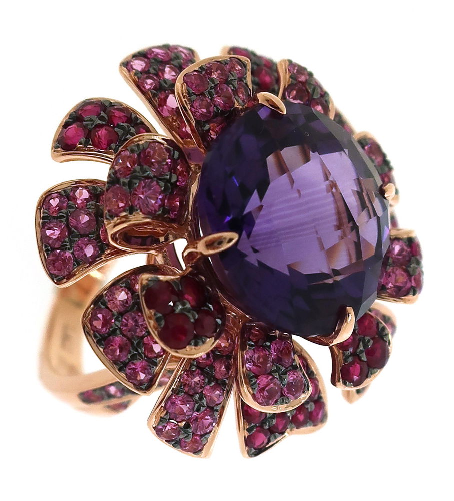 14K ROSE GOLD PINK SAPPHIRE, RUBY, AND AMETHYST RING