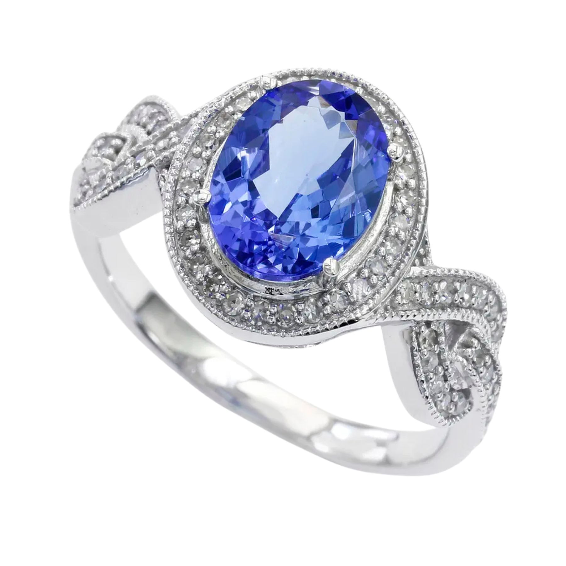 Brilliant diamonds frame a vivid tanzanite center stone in this elegant white gold ring.• 9x7mm Oval Tanzanite Gemstone• 14K White Gold Setting• Diamond Accents• Fine Gemstone Ring Collection