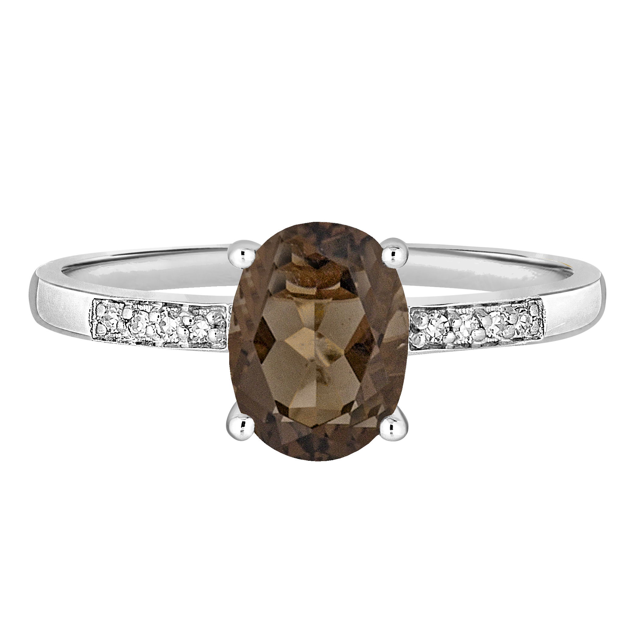 Radiant smoky quartz is set alongside glittering diamonds in this refined white gold ring.• 8x6mm Oval Smoky Quartz Gemstone• 14K White Gold Setting• Diamond Accents• Semi Precious Birthstone Collection