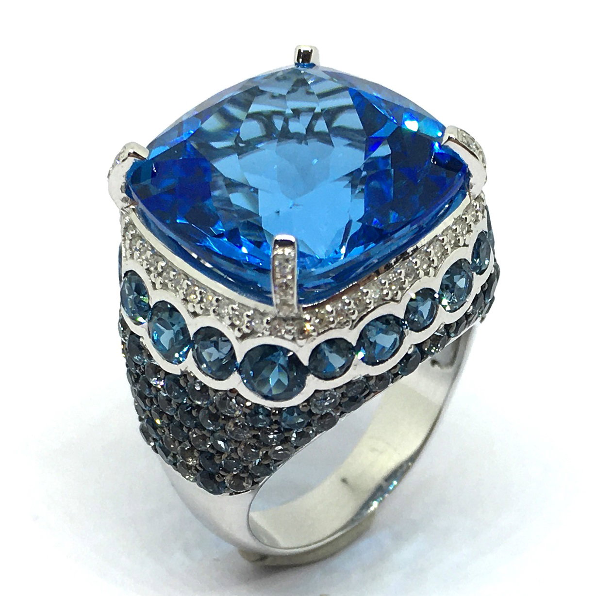 14K WHITE GOLD DIAMOND, SHADED BLUE TOPAZ AND SWISS BLUE TOPAZ RING