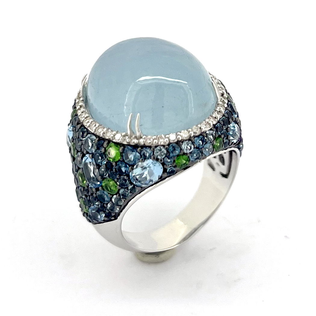 14K WHITE GOLD DIAMOND, MULTICOLOR GEM STONE AND MILKY AQUAMARINE RING