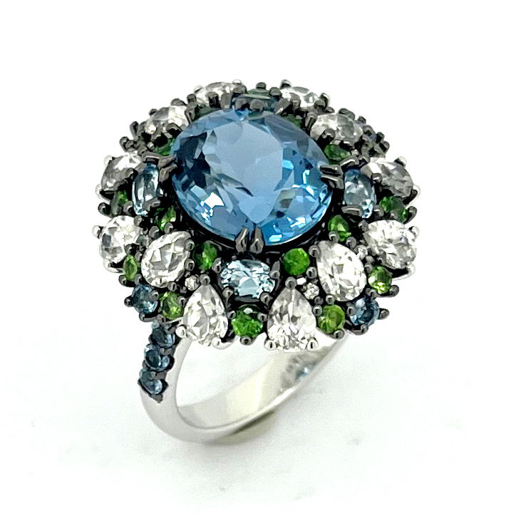 14K WHITE GOLD DIAMOND, MULTICOLOR GEM AND ELECTRIC BLUE TOPAZ RING