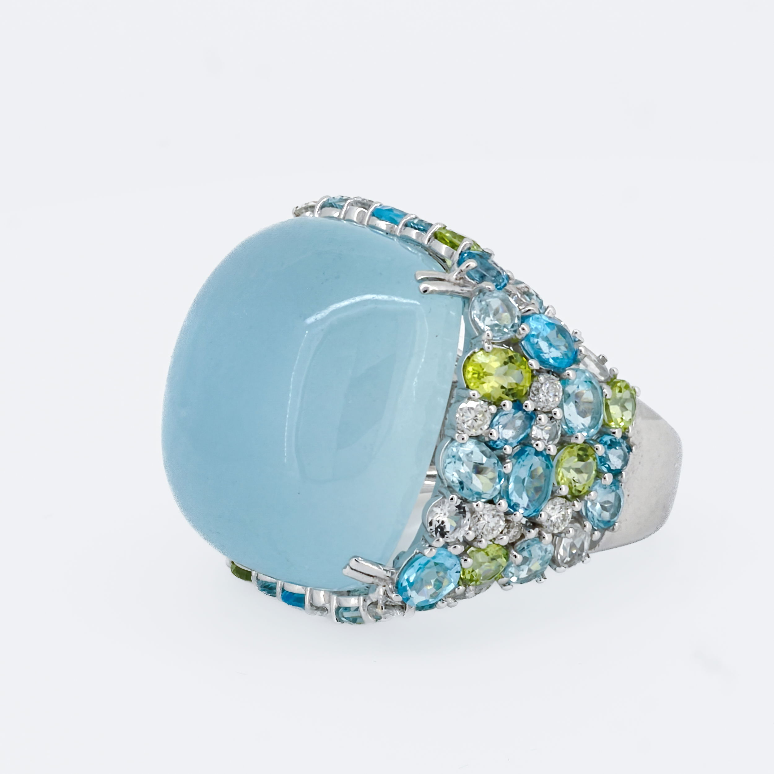 14K WHITE GOLD DIAMOND, MULTICOLOR GEM STONES AND MILKY AQUAMARINE RING