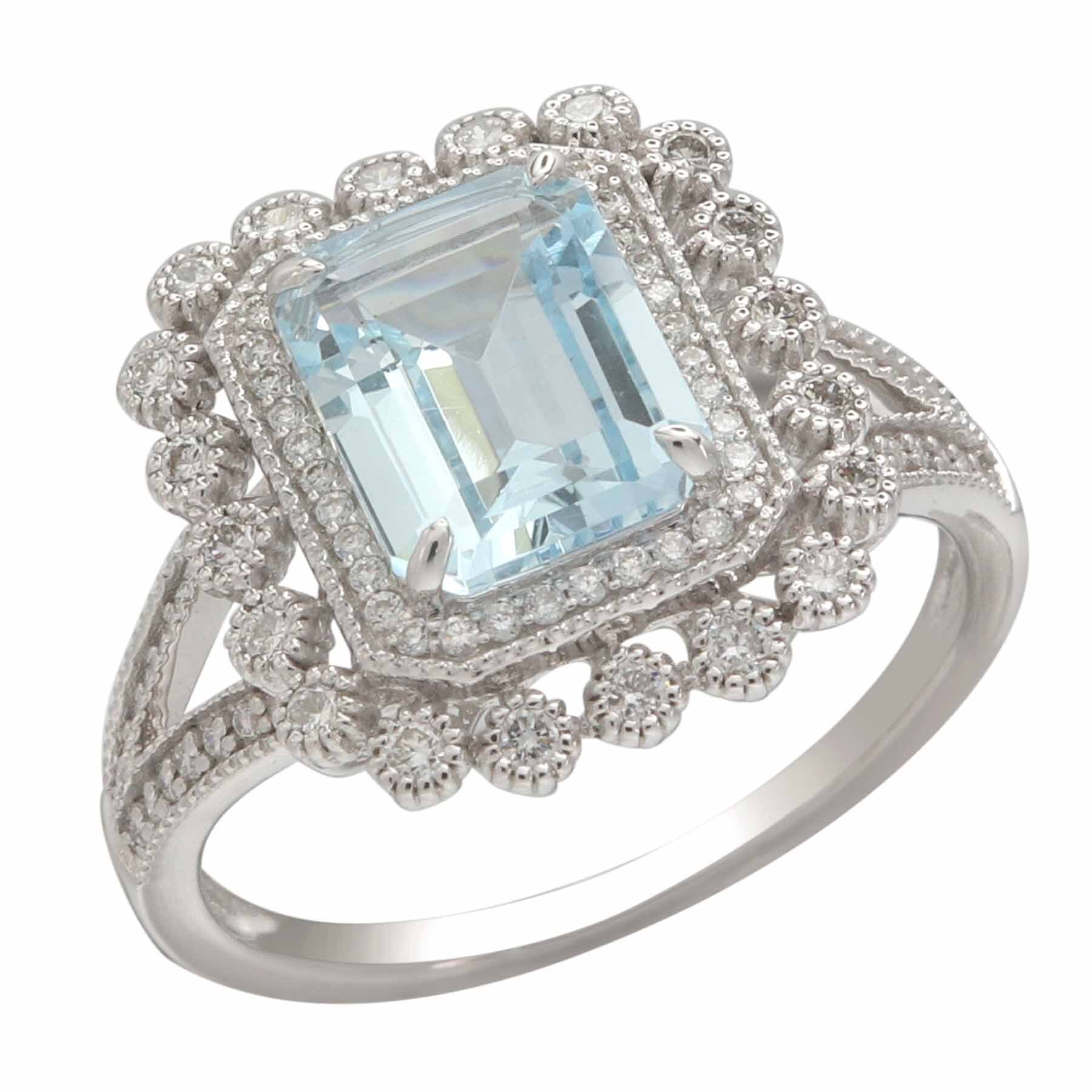 14K WHITE GOLD DIAMOND AND AQUAMARINE RING