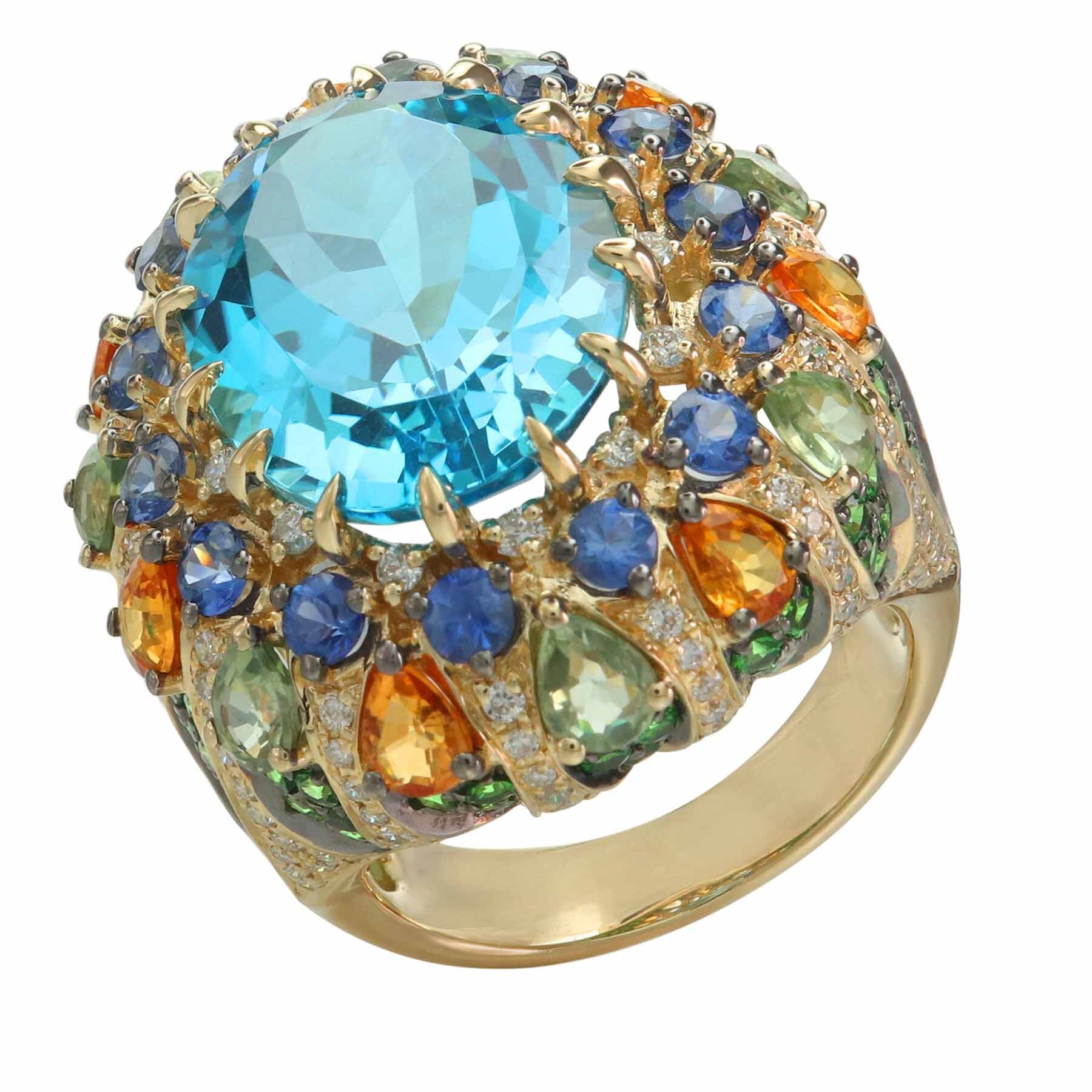 14K YELLOW GOLD DIAMOND, TSAVORITE, MULTICOLOR SAPPHIRE AND SWISS BLUE TOPAZ RING