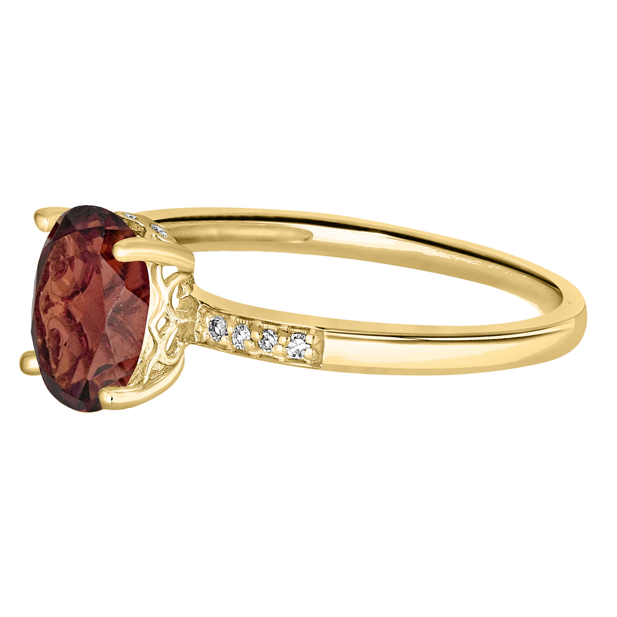 Radiant garnet is set alongside glittering diamonds in this refined yellow gold ring.• 8x6mm Oval Garnet Gemstone• 14K Yellow Gold Setting• Diamond Accents• Semi Precious Birthstone Collection