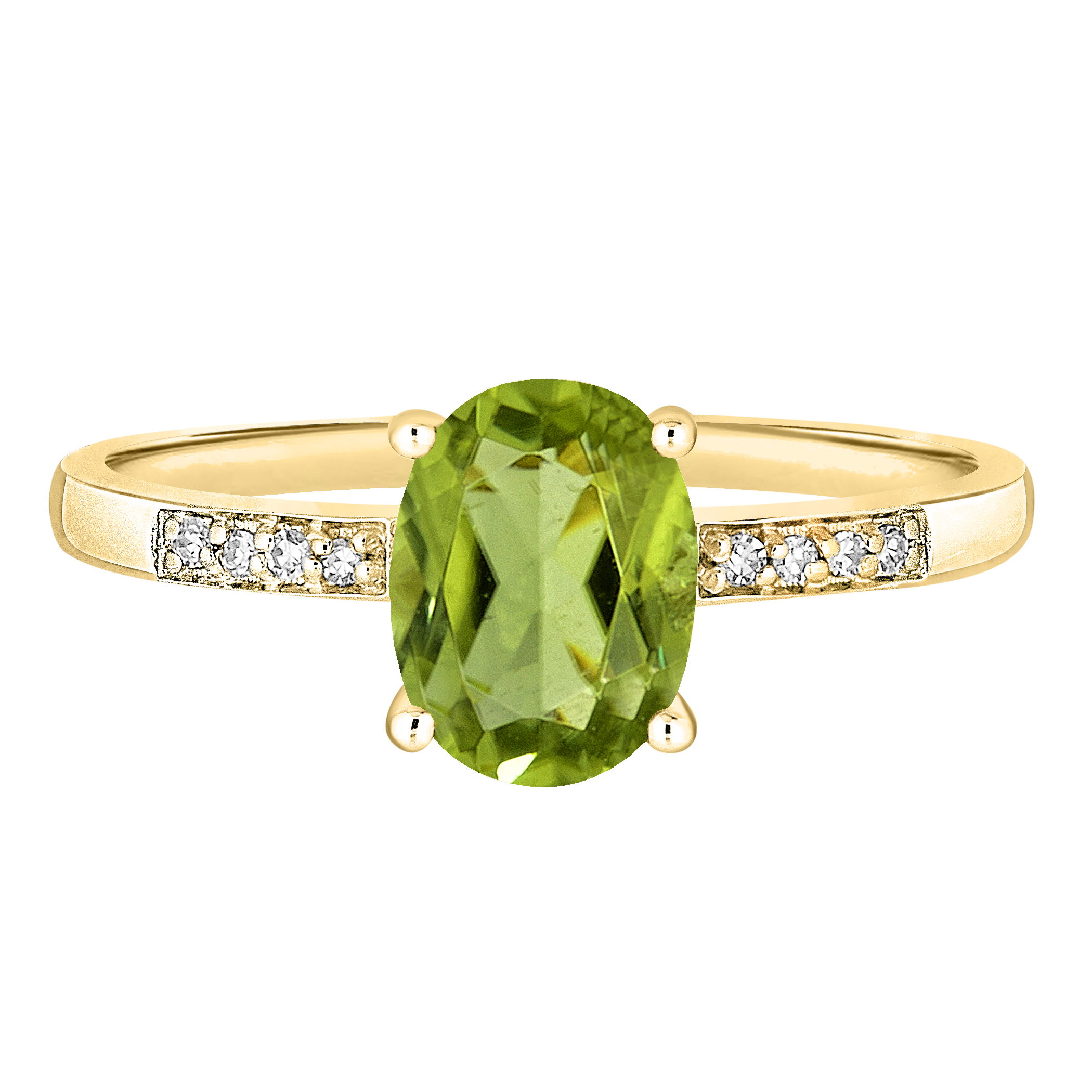 Radiant peridot is set alongside glittering diamonds in this refined yellow gold ring.• 8x6mm Oval Peridot Gemstone• 14K Yellow Gold Setting• Diamond Accents• Semi Precious Birthstone Collection