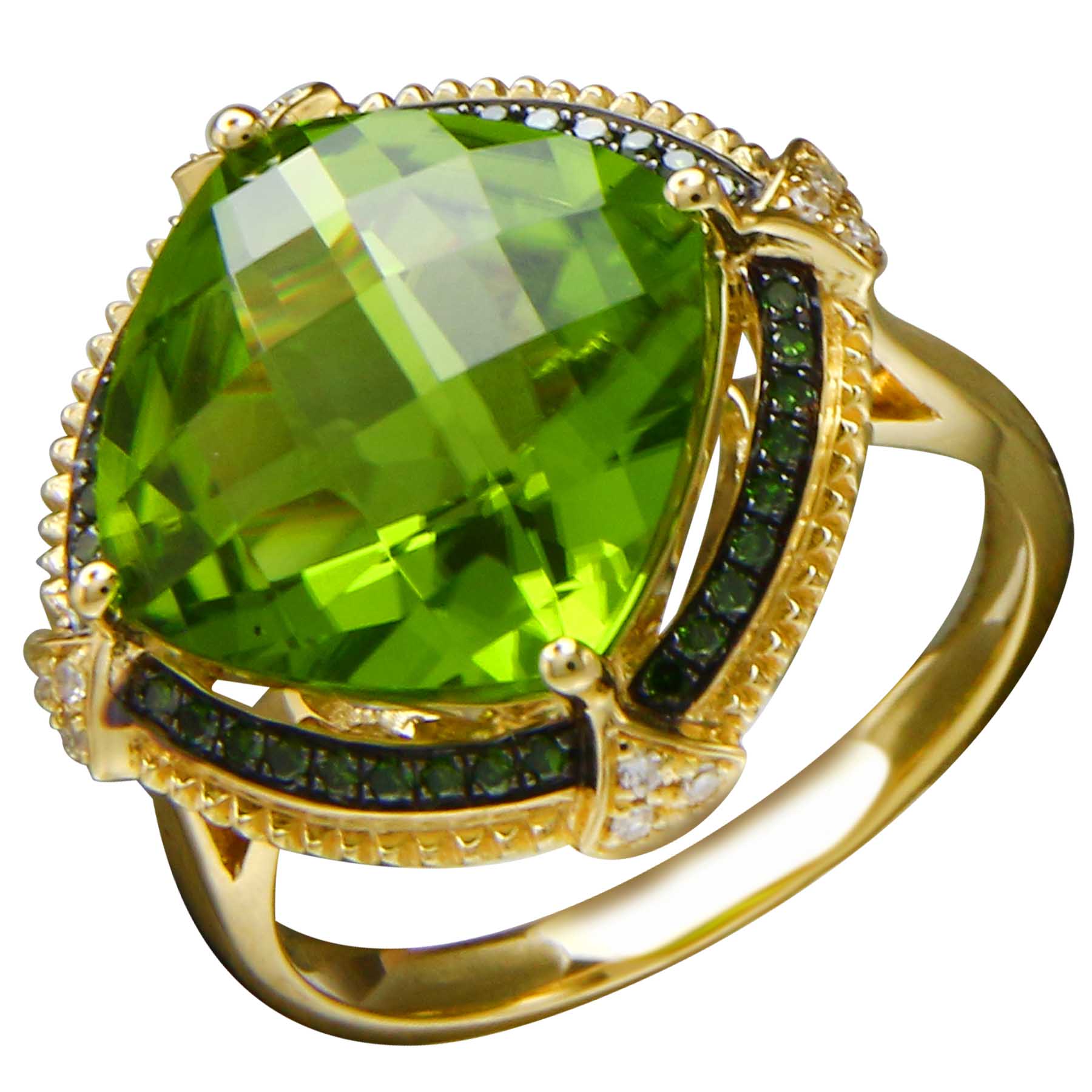 14K YELLOW GOLD DIAMOND, TREATED GREEN DIAMOND AND PERIDOT RING