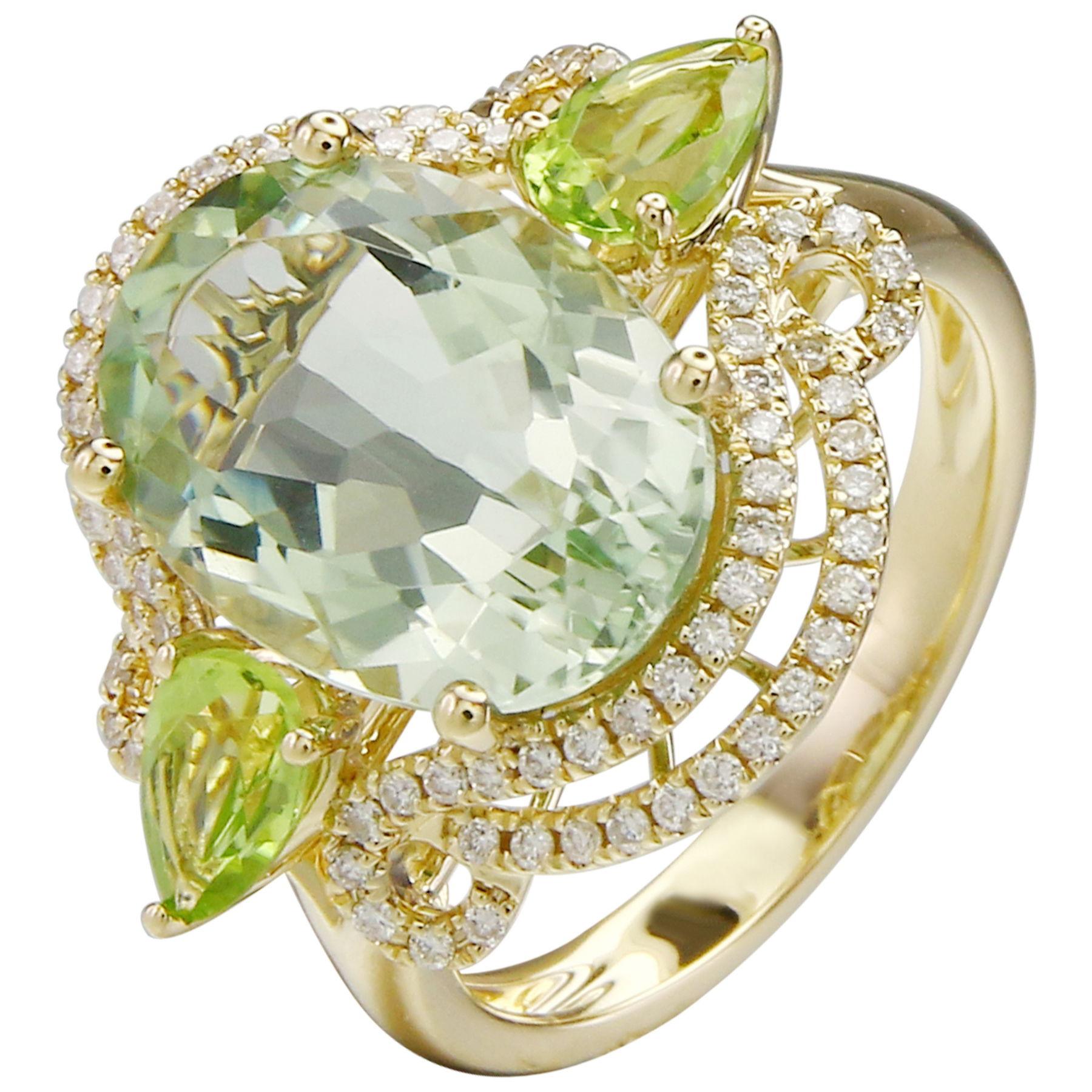 14K YELLOW GOLD DIAMOND, PERIDOT AND GREEN AMETHYST RING
