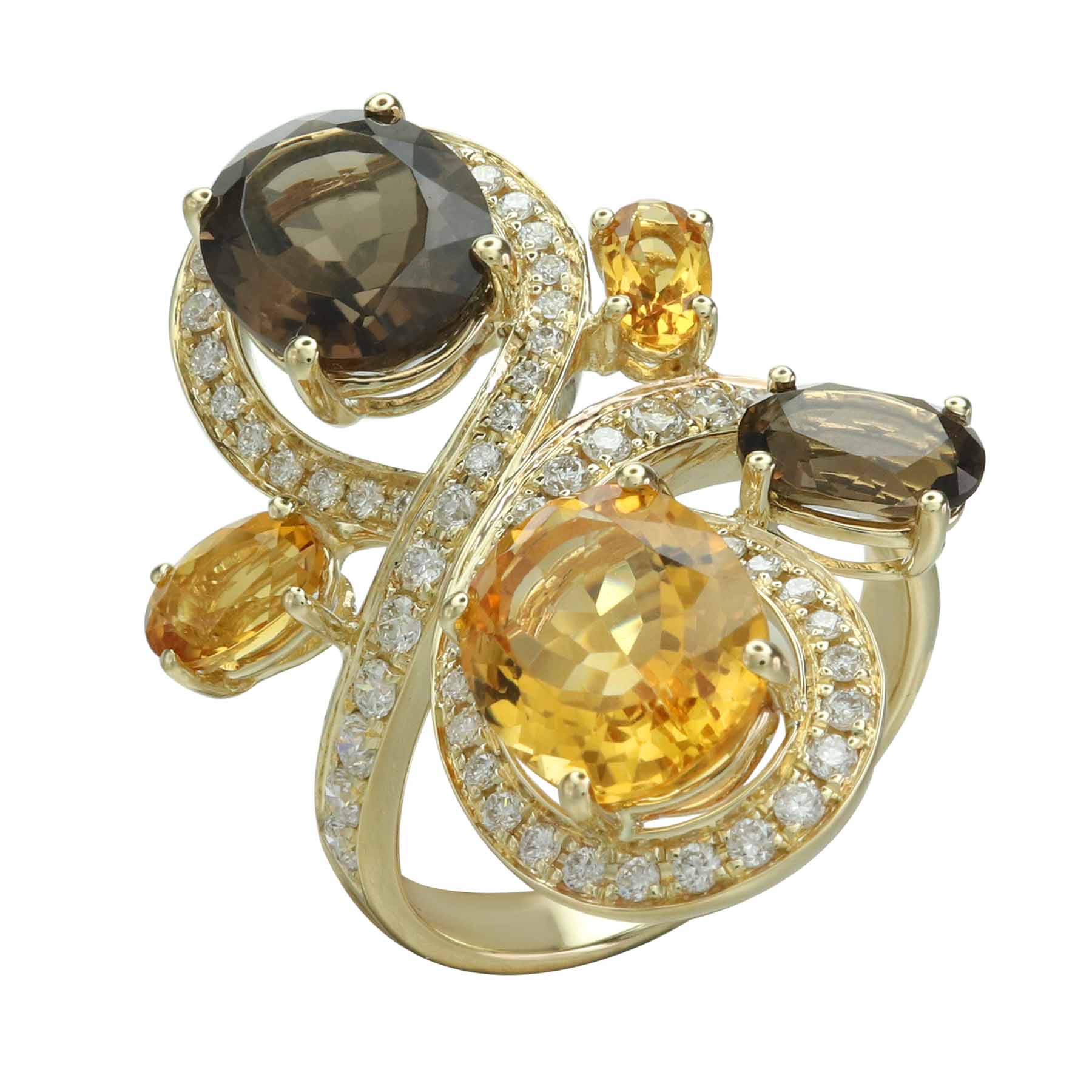 14K YELLOW GOLD DIAMOND, CITRINE AND SMOKY QUARTZ RING