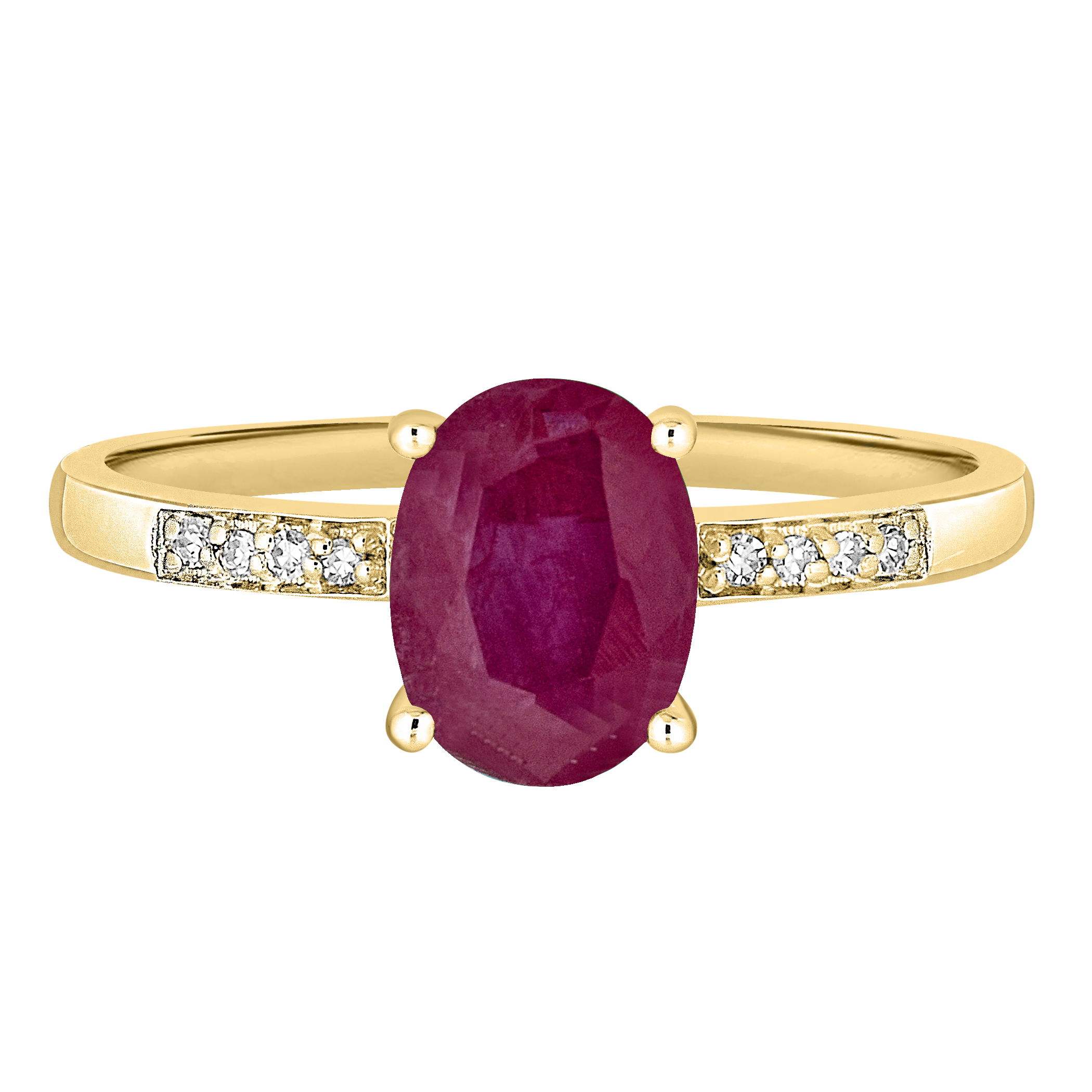 Fiery red ruby is accented with dazzling diamonds in this luxurious yellow gold ring.• 7x5mm Oval Ruby Gemstone• 14K Yellow Gold Setting• Precious Birthstone Collection