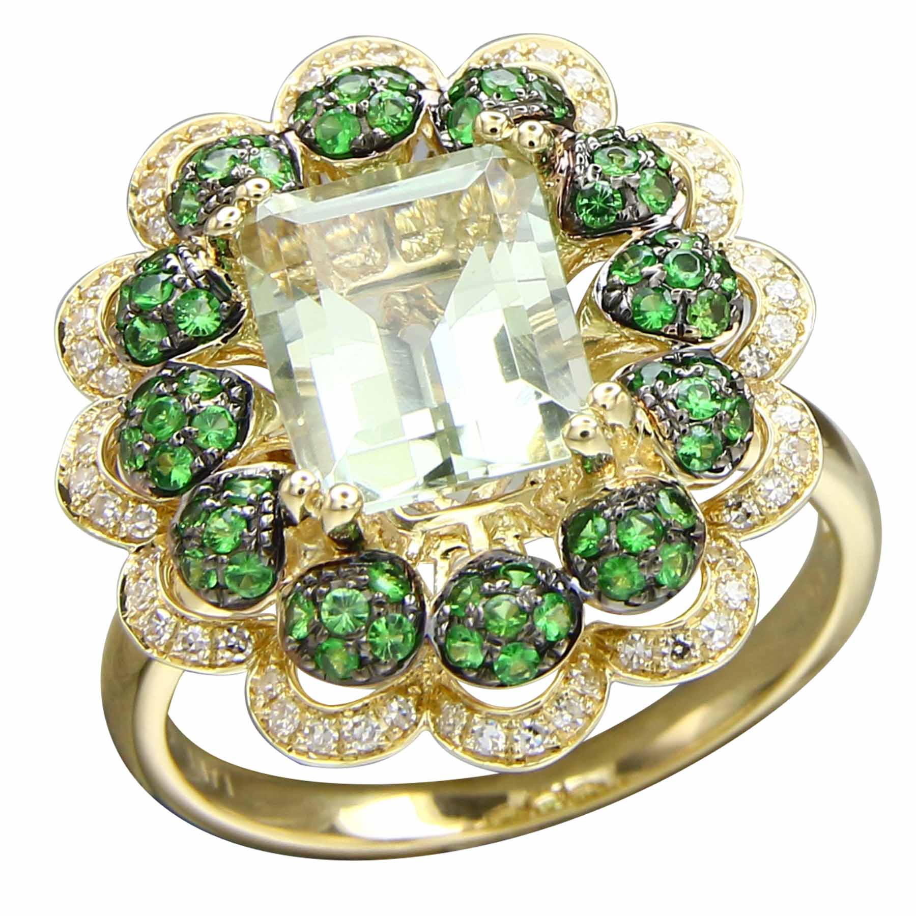 14K YELLOW GOLD DIAMOND, TSAVORITE AND GREEN AMETHYST RING