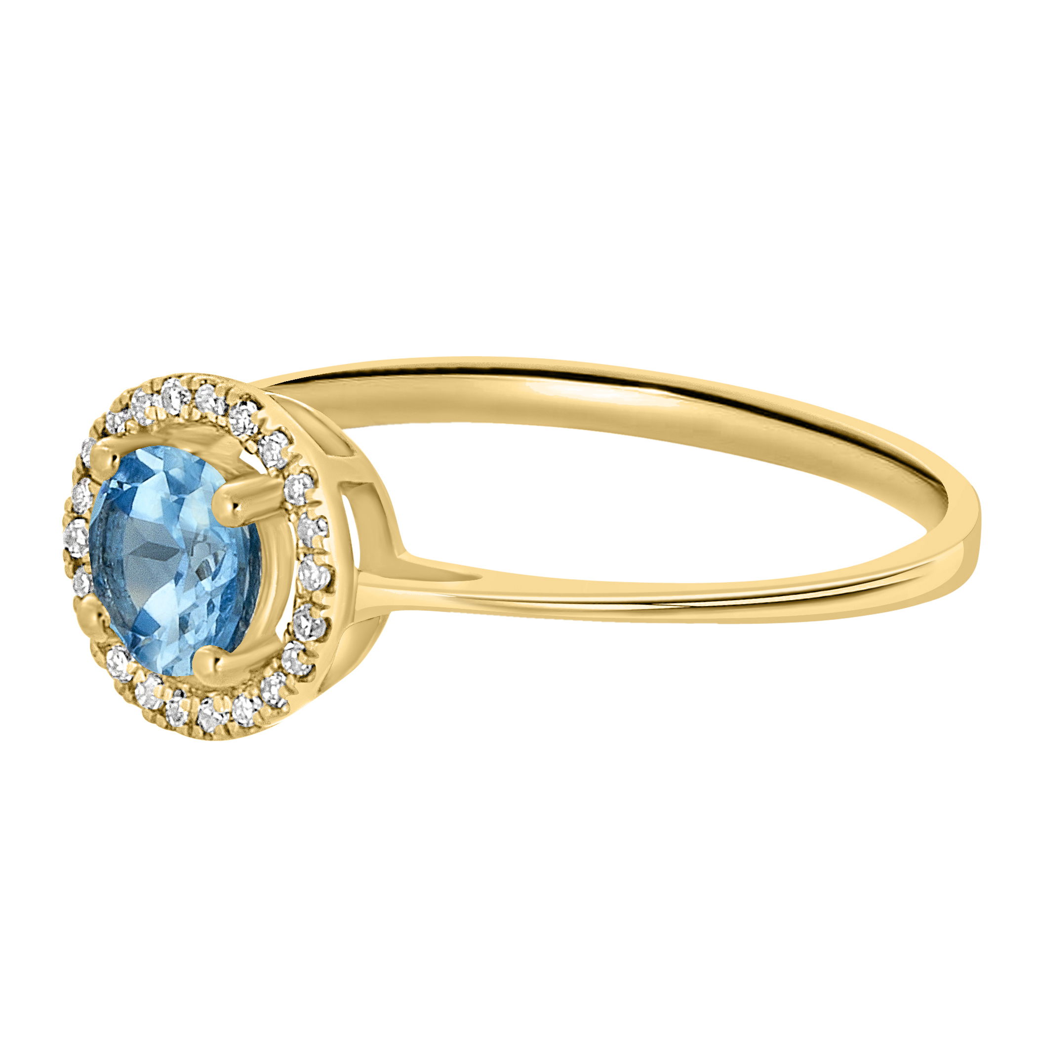 Brilliant blue topaz is accented with sparkling diamonds in this stunning yellow gold ring.• 5mm Round Blue Topaz Gemstone• 14K Yellow Gold Setting• Semi Precious Birthstone Collection