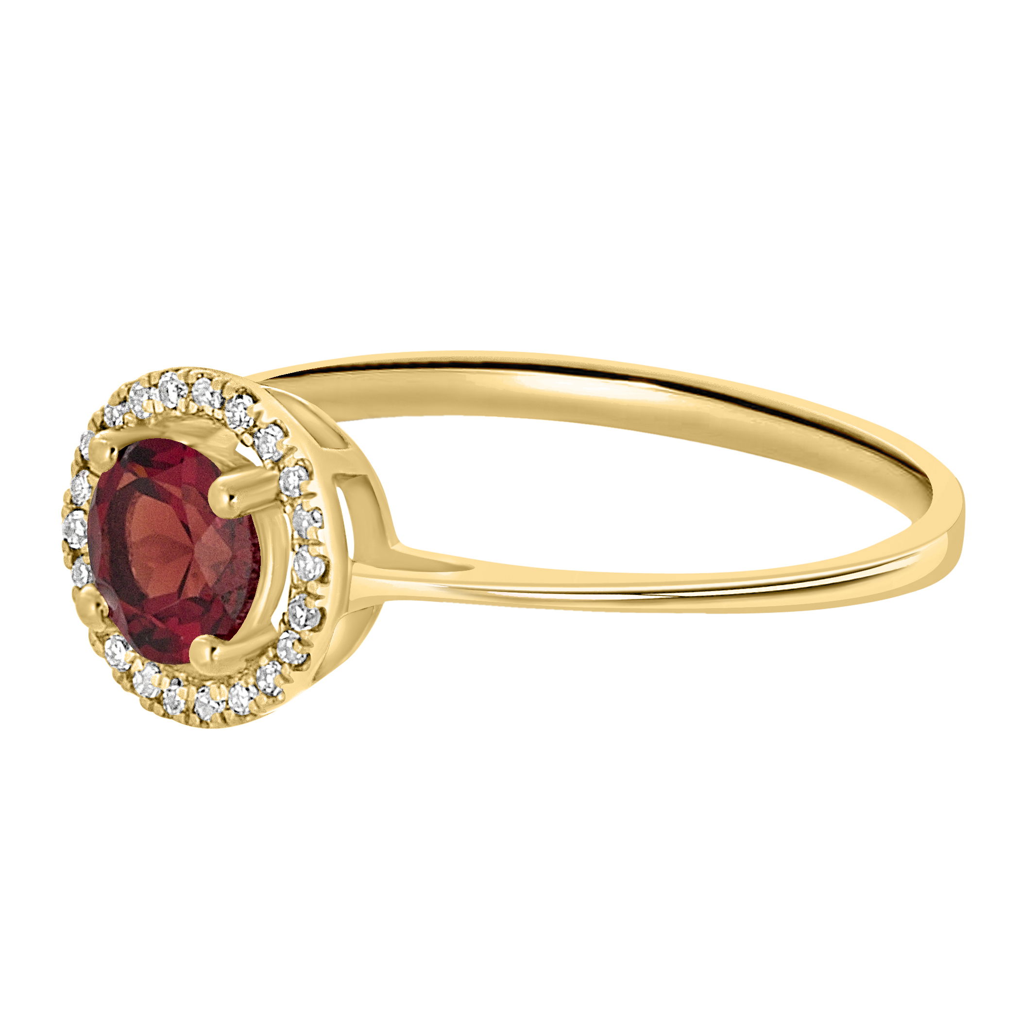 Deep garnet is accented with sparkling diamonds in this stunning yellow gold ring.• 5mm Round Garnet Gemstone• 14K Yellow Gold Setting• Semi Precious Birthstone Collection
