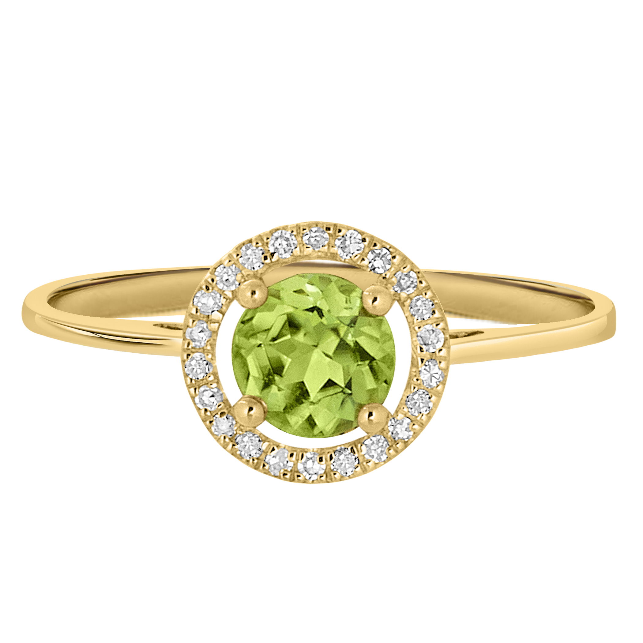 Brilliant peridot is accented with sparkling diamonds in this stunning yellow gold ring.• 5mm Round Peridot Gemstone• 14K Yellow Gold Setting• Semi Precious Birthstone Collection