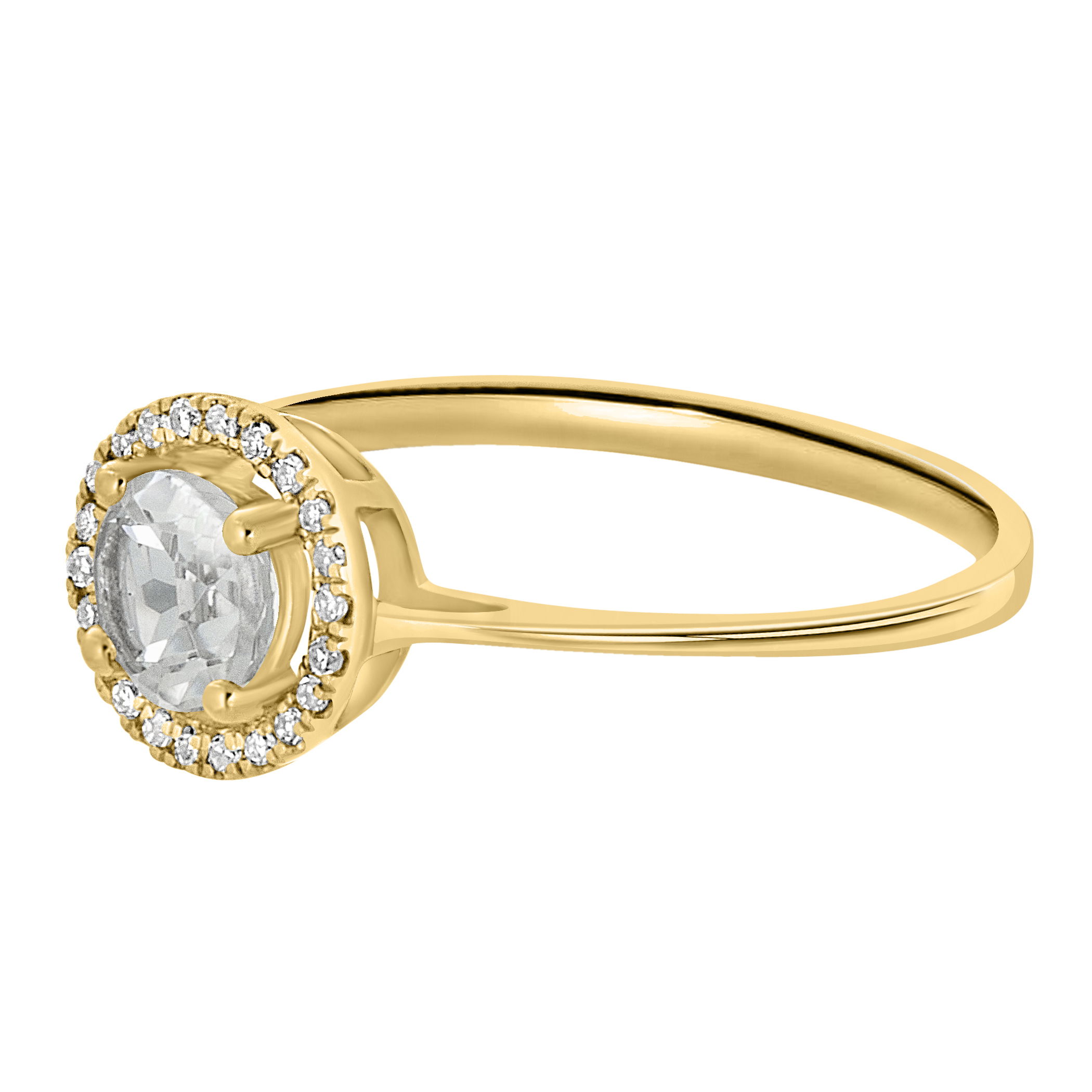 Brilliant white topaz is accented with sparkling diamonds in this stunning yellow gold ring.• 5mm Round White Topaz Gemstone• 14K Yellow Gold Setting• Semi Precious Birthstone Collection