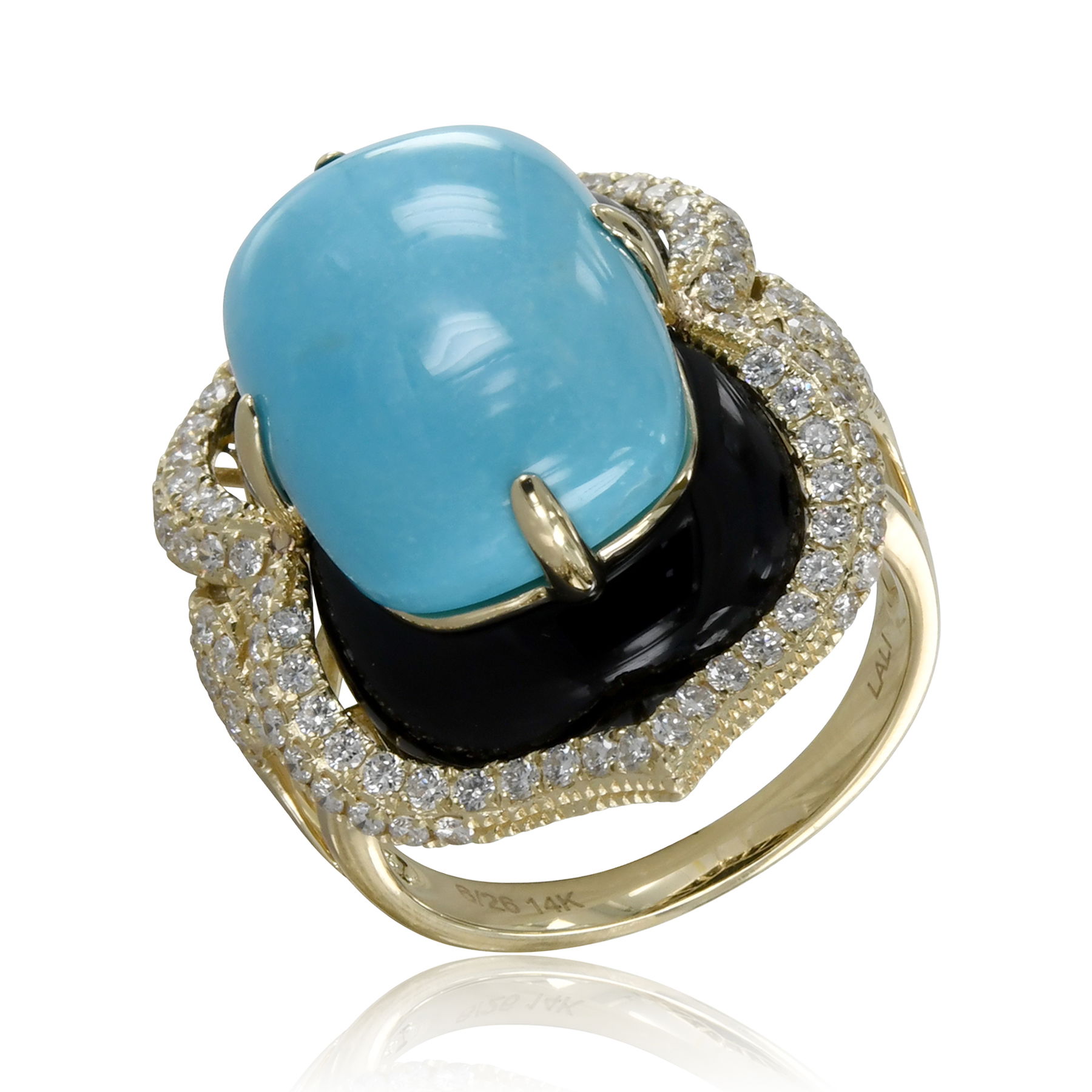 14K YELLOW GOLD DIAMOND, ONYX AND TURQUOISE RING