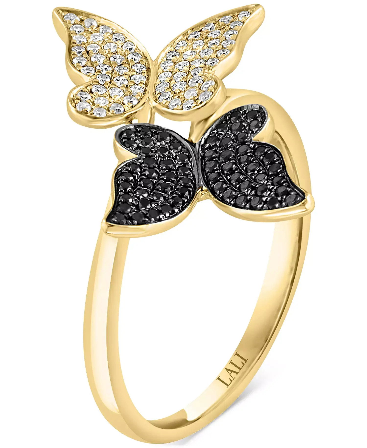 14K YELLOW GOLD DIAMOND AND TREATED BLACK DIAMOND BUTTERFLY RING