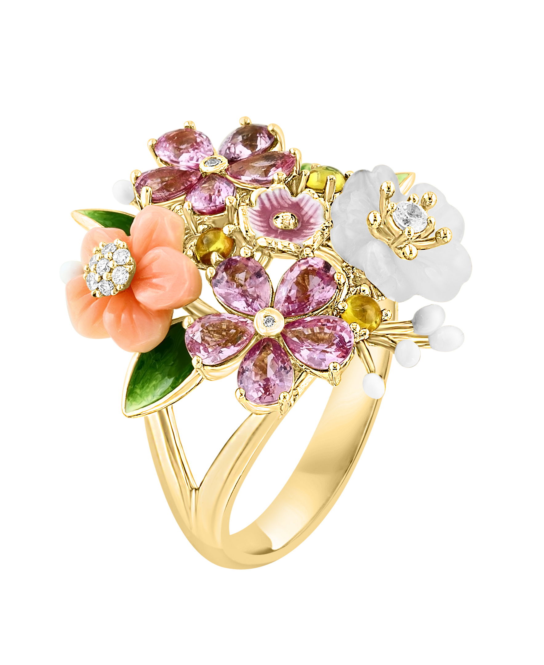 14K YELLOW GOLD DIAMOND, ROSE QUARTZ, MULTICOLOR SAPPHIRE, AND PINK MOTHER OF PEARL FLOWER ENAMEL RING