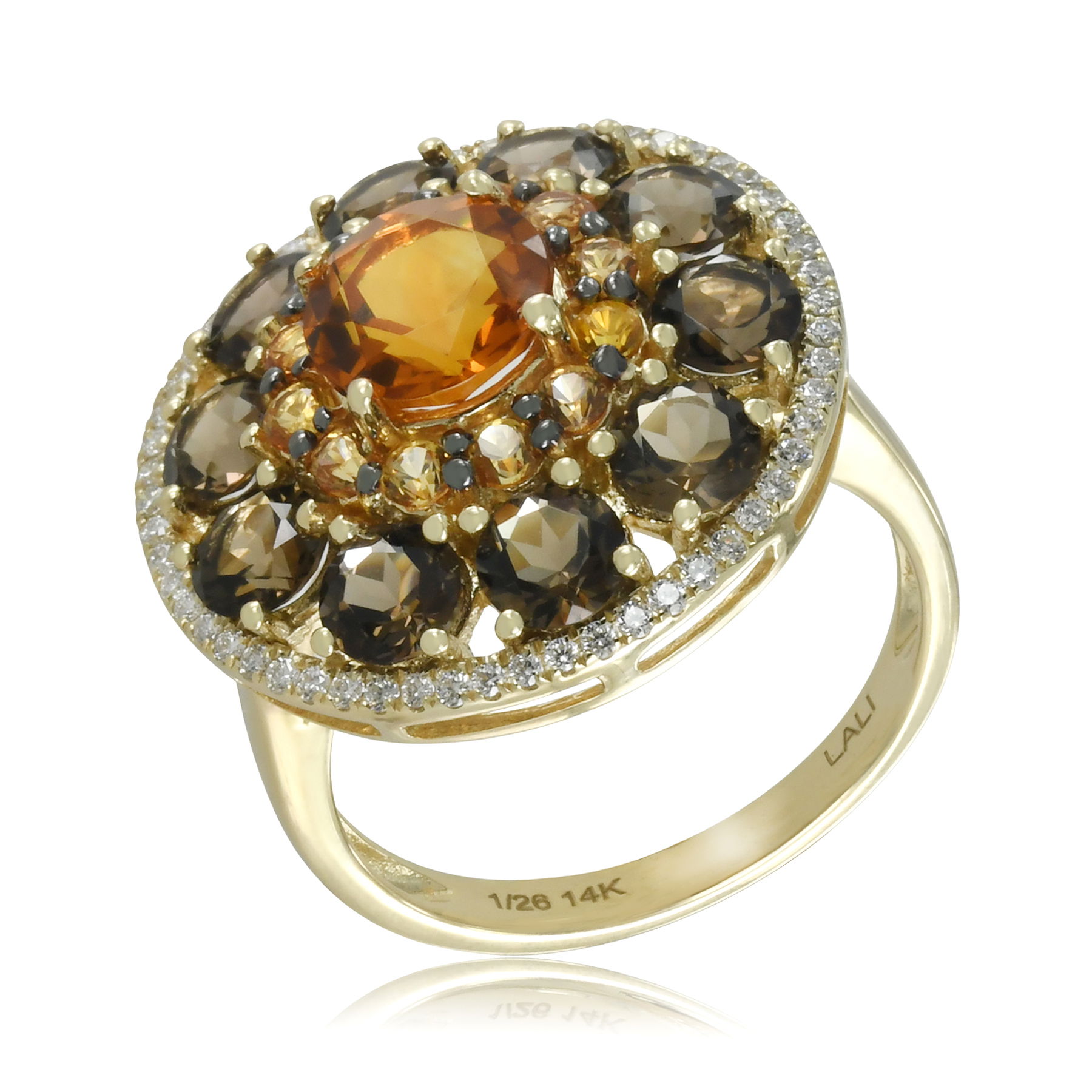 14K YELLOW GOLD DIAMOND, TREATED ORANGE SAPPHIRE, SMOKY QUARTZ, AND CITRINE RING